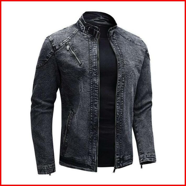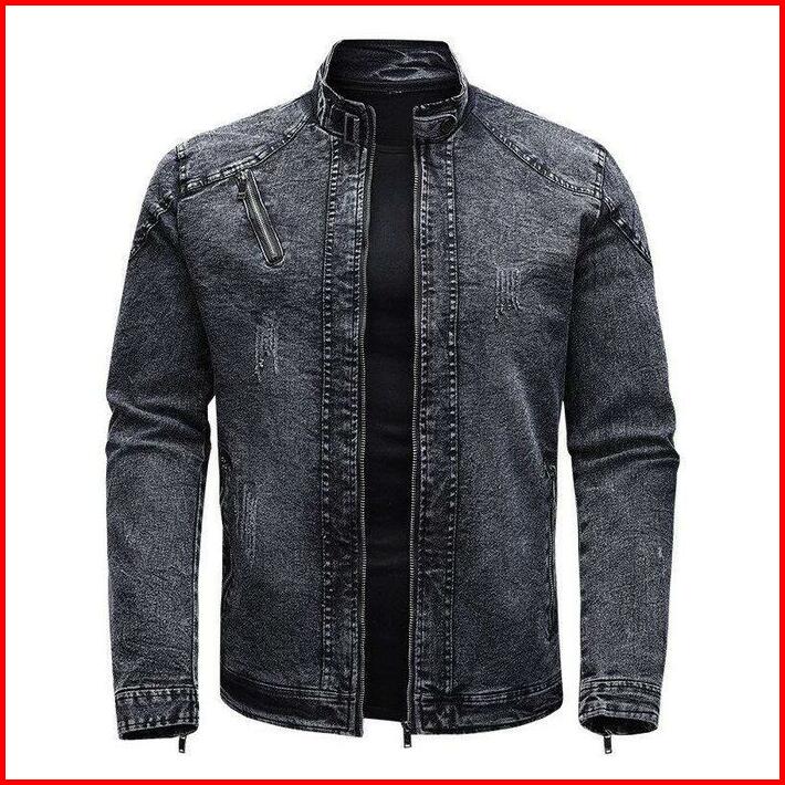 Jaket Jeans Bahan Denim Krah Tinggi Jaket Biker Biru Casual Keren