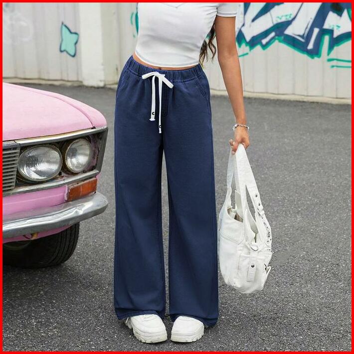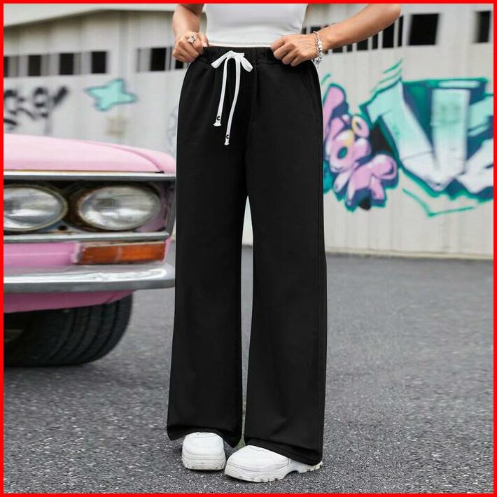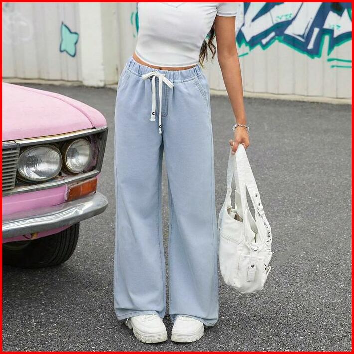 Baggy Celana Jeans Plus Size Straight Cut Loose Korean Style Elastic Waistband Seluar Palazzo Jeans Wanita