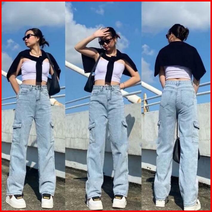 Celana Cargo Highwaist Loose Jeans Baggy Wanita Kulot Cargo Highwaist