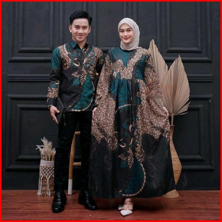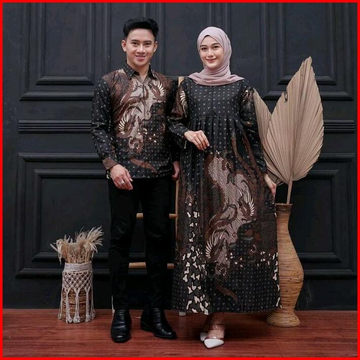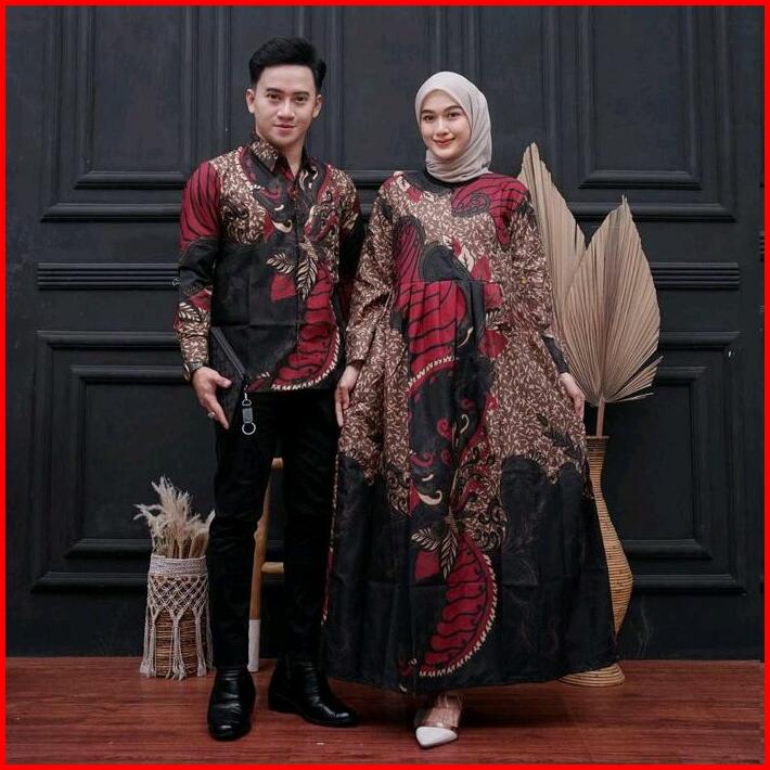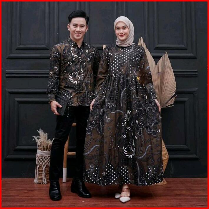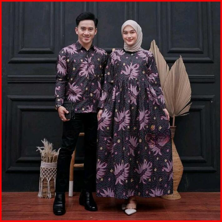Baju Couple Batik Kemeja Pria Lengan Panjang Dan Gamis Wanita Syari Muslimah Pasangan Sarimbit Dress Kondangan Pesta