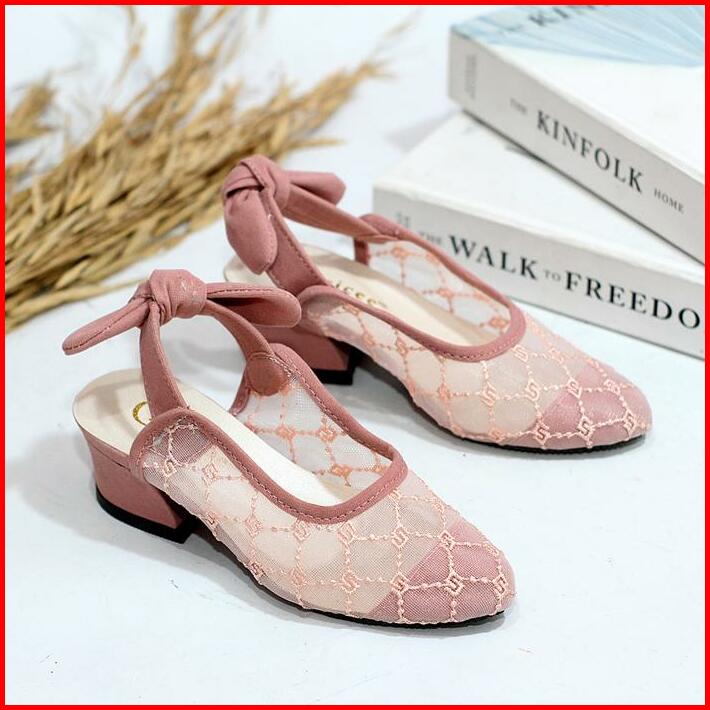 Sepatu Sandal Pesta Anak Perempuan Hak Tahu 3 Cm Brukat Jala Selop Motif Pita