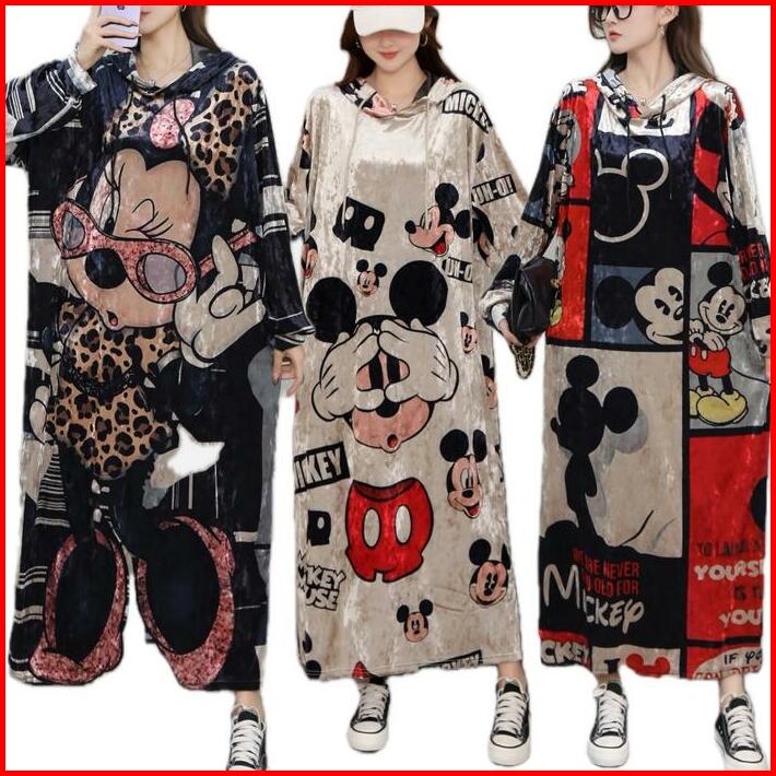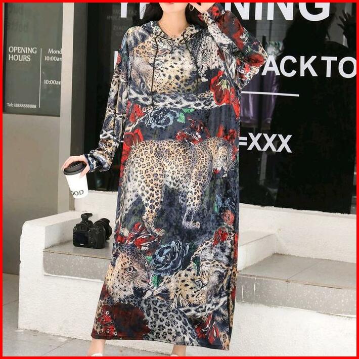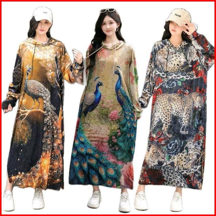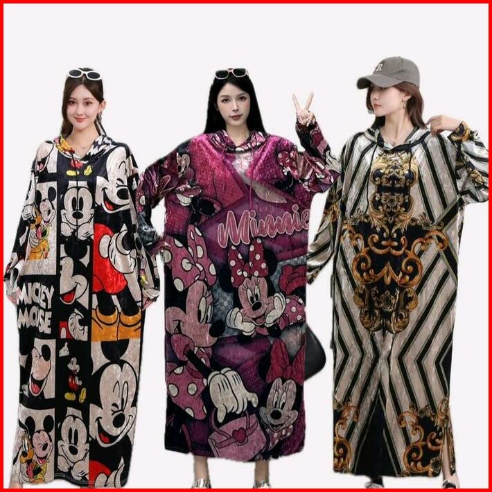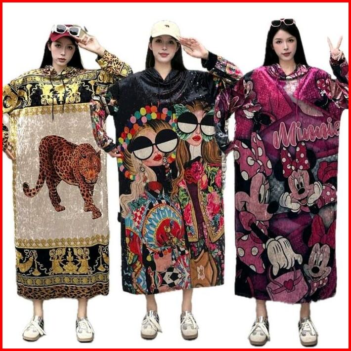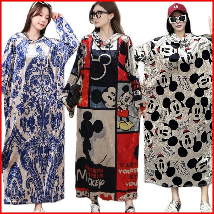 Long Dress Hoodie Velvet Bludru Lengan Panjang Motif Jumbo