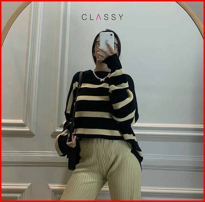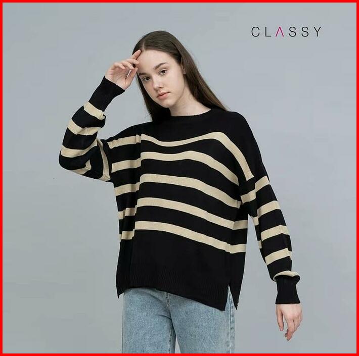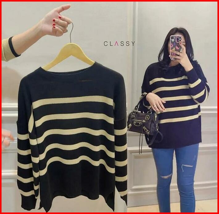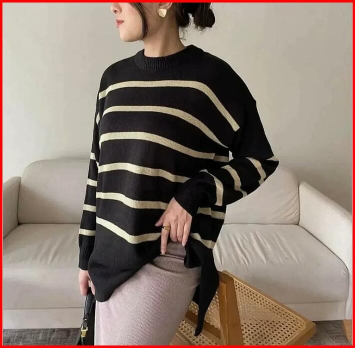 Jisoo Sweater Rajut Oversize Motif Salur Knitwear Baju Wanita Atasan Panjang Top