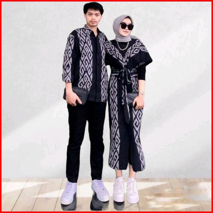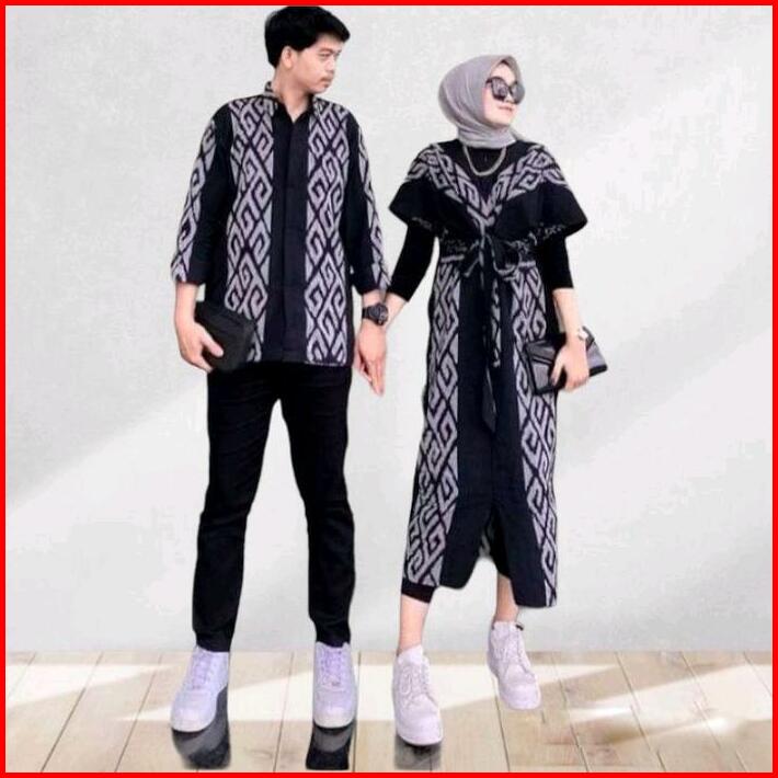 Couple Batik Tenun Gamis Wanita Kemeja Panjang Pendek Maxxy Clara Black Bunga Garis Black Mamba