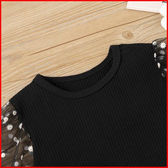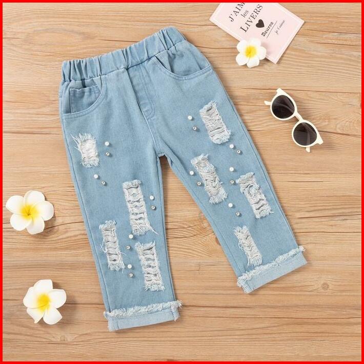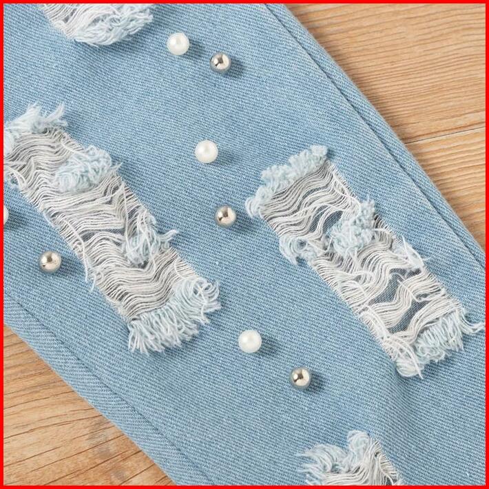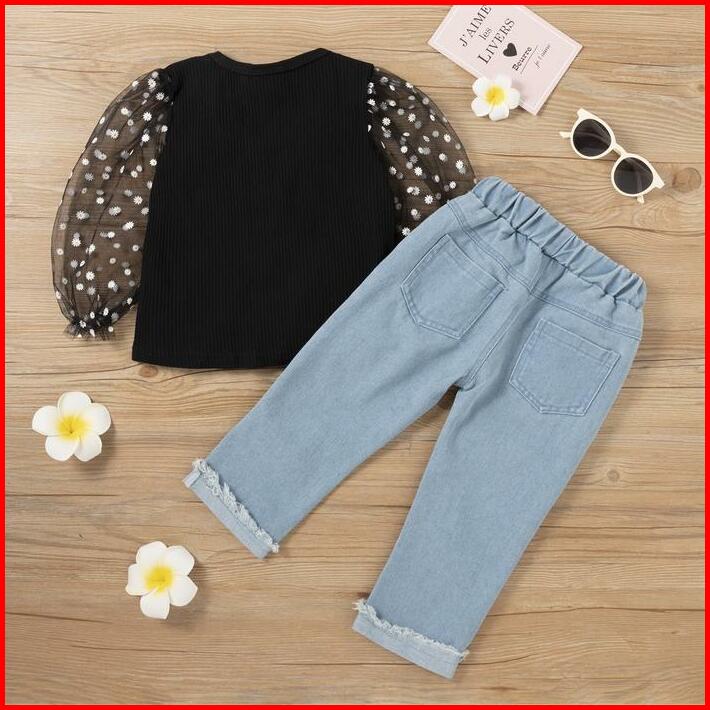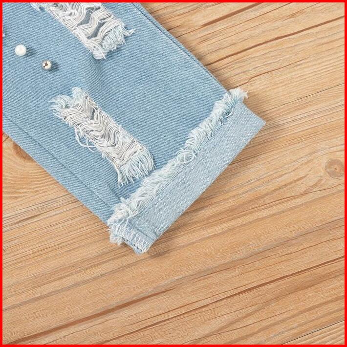 Kfo82-setelan Set Anak Perempuan Kaos Rajut Rip Jeans Mutiara Baju Celana Fashion
