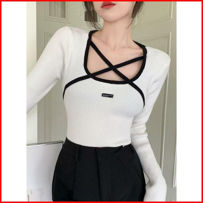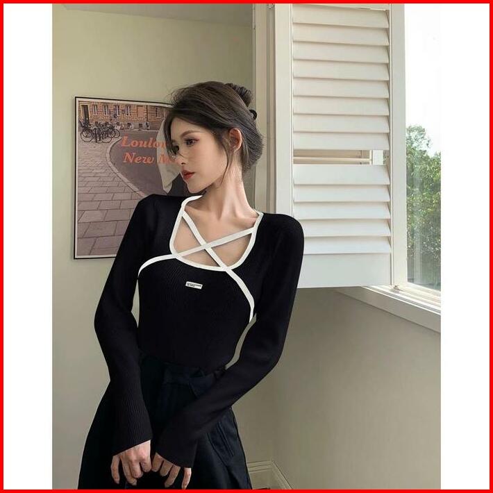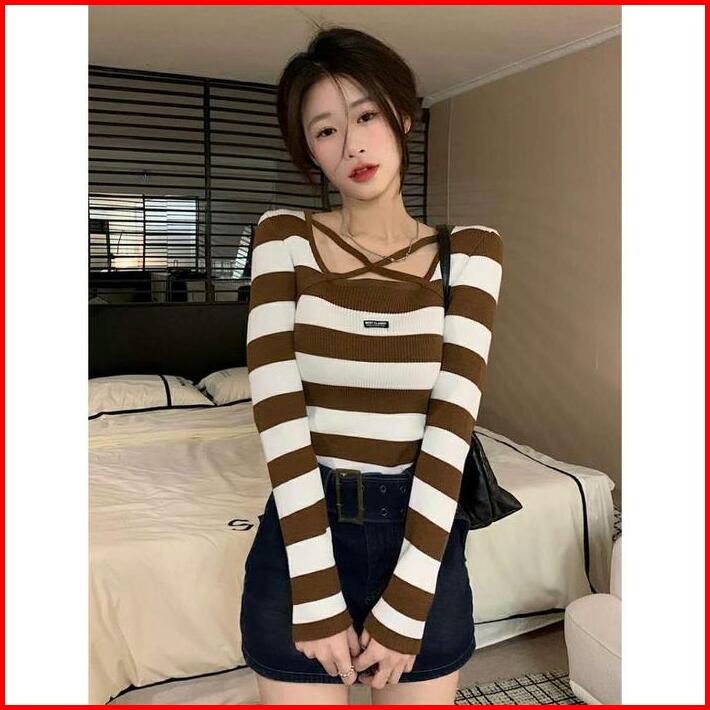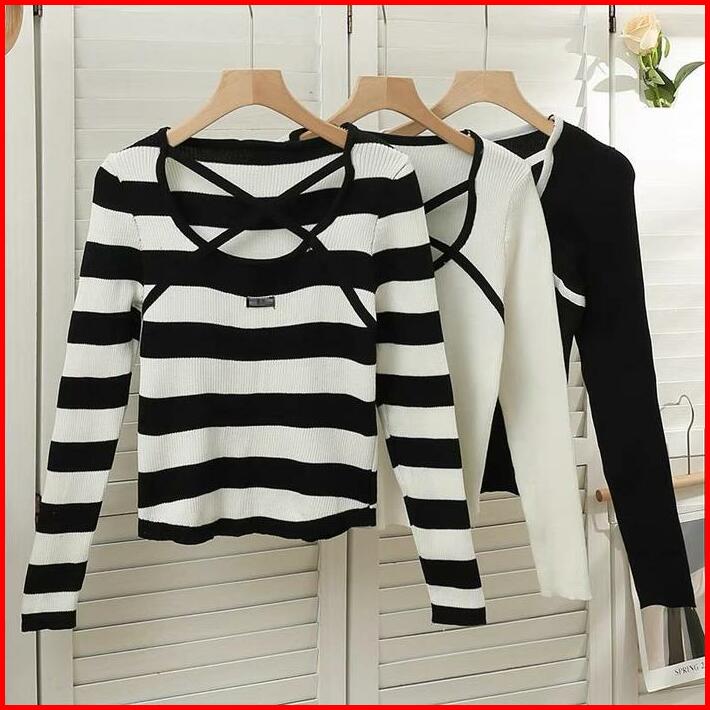 J043 Atasan Rajut Wanita Atasan Korean Style Atasan Lengan Panjang Baju Garis Hitam Putih