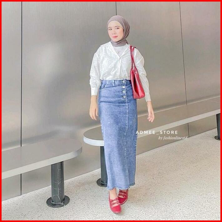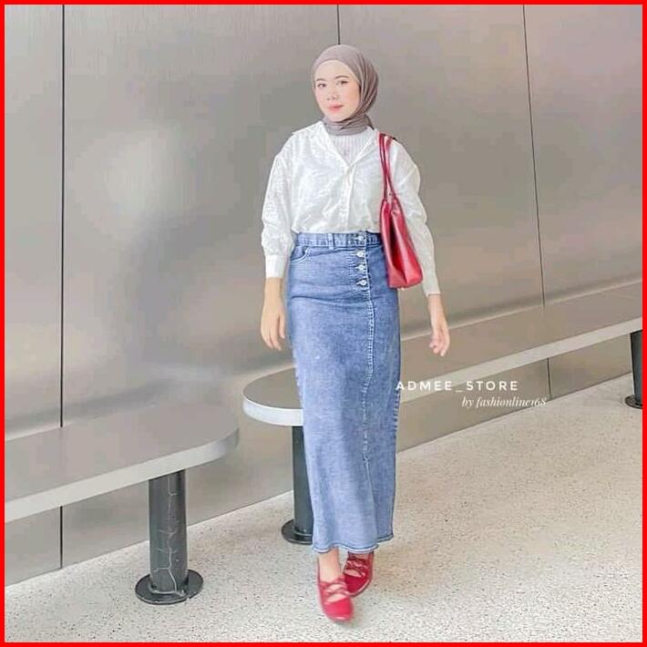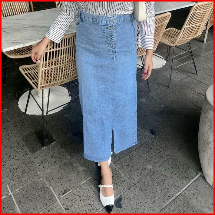 Rok Jeans Wanita Skirt Belah Samping Panjang Dewasa Kancing Rok Premium Rok Span Outfit Karet Denim Tebal