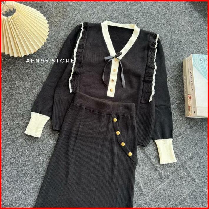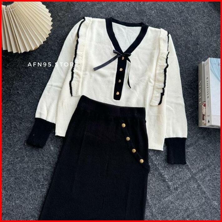 Setelan Rajut Wanita Oneset Rok Helena Dengan Pita Kancing Top