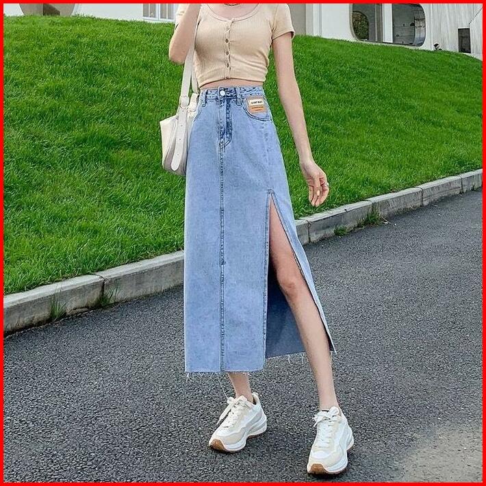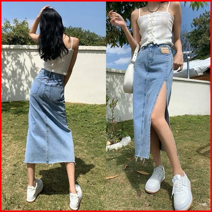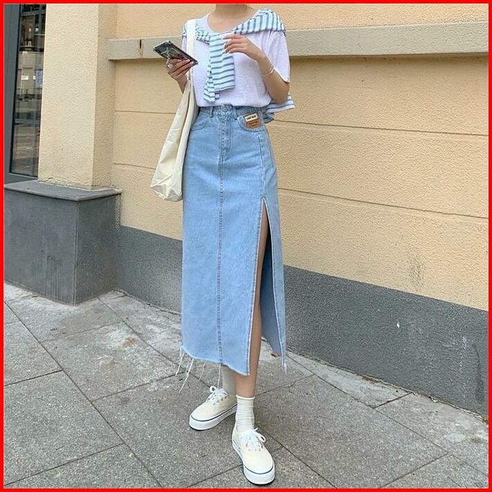 Beevalue Rok Denim Hw Midi Wanita Belah Samping Unfinishing Cutting Rok Jeans Midi Wanita Bahan Premium Warna Light Blue