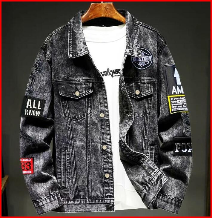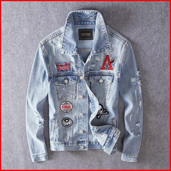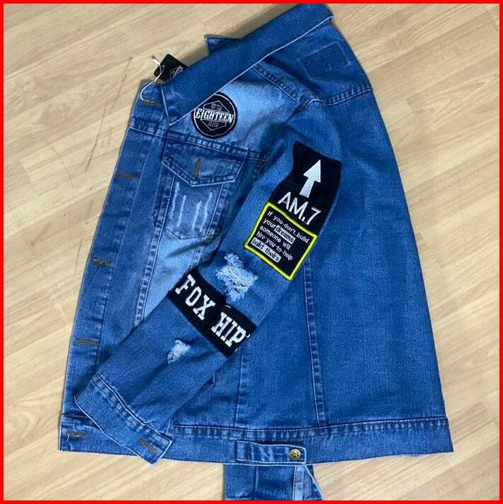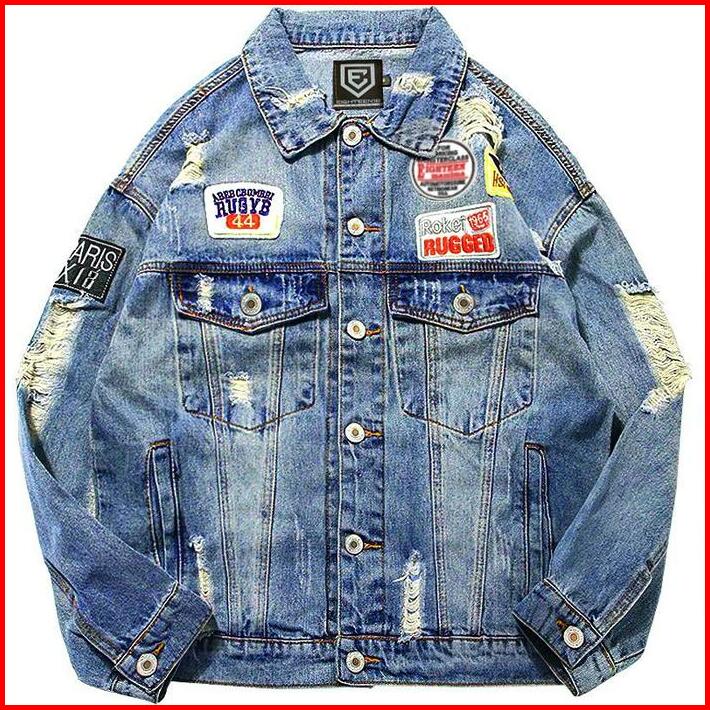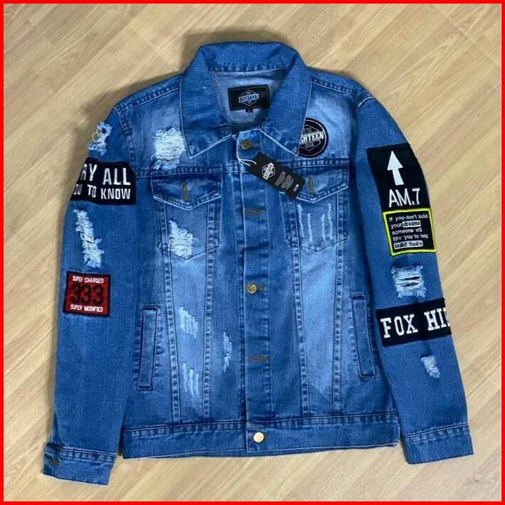Jaket Jeans Pria Wanita Hiphop Blit Full Bordir Dewasa Kantong Motif Distro Denim Cowok Biru