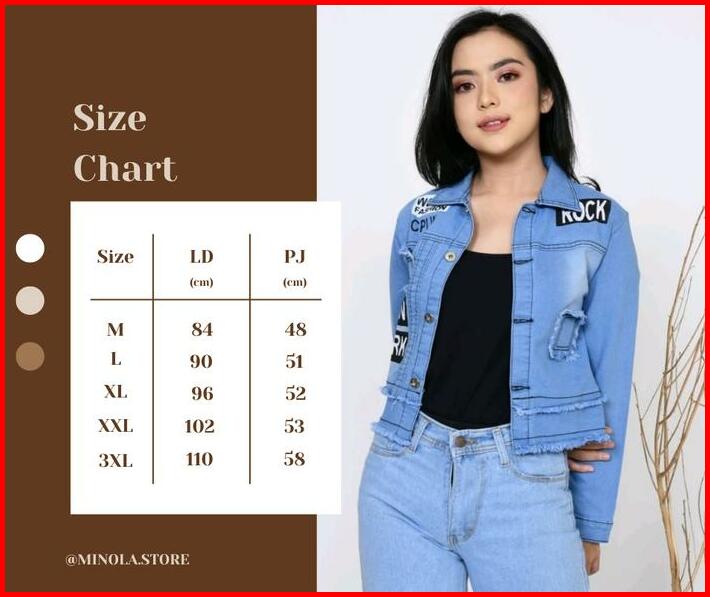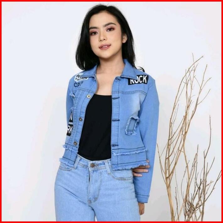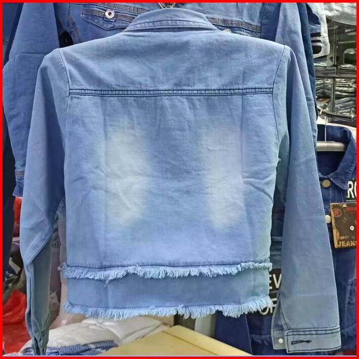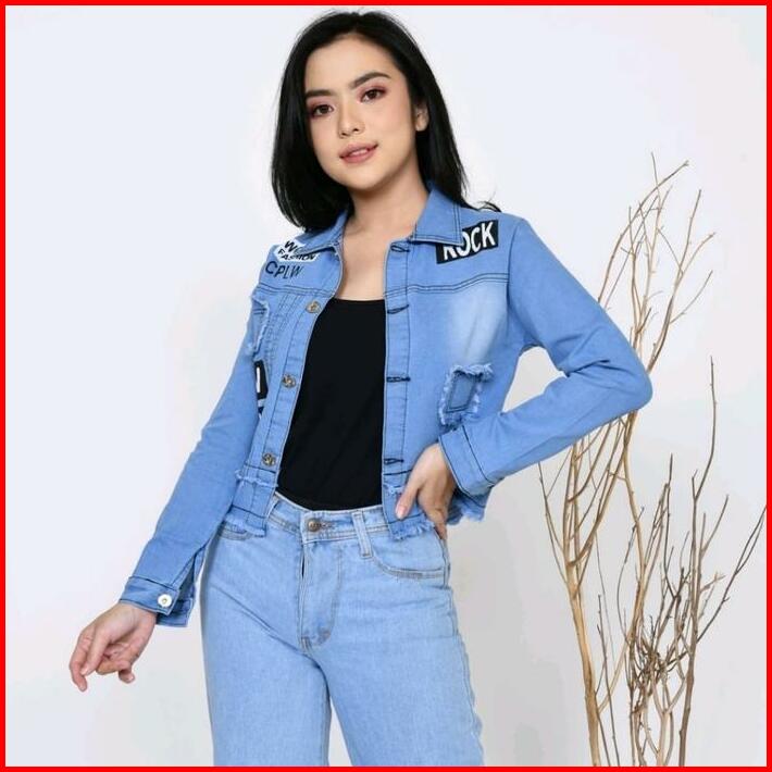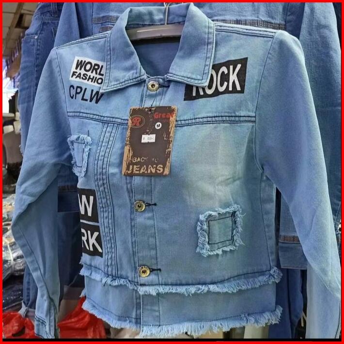Jaket Jeans Denim Atasan Wanita Tangan Panjang Kancing Rumbai Sablon Rock Semi Crop Cewek Kekinian Keren