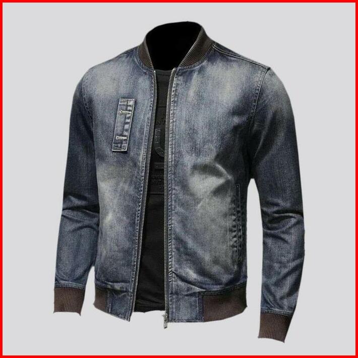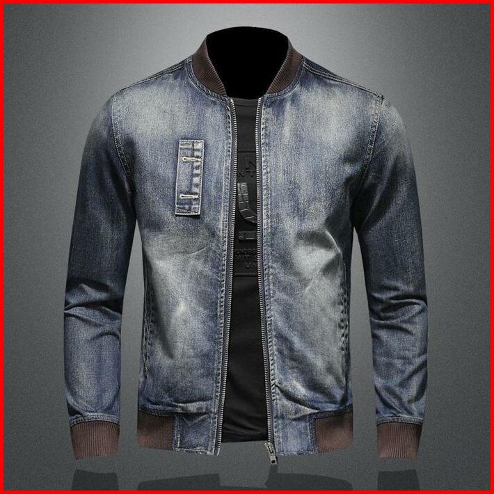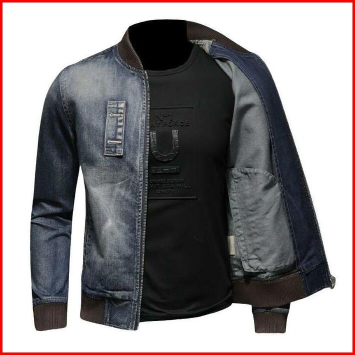 Mamima-jaket Jeans Pria Model Boomber Bahan Denim Kerah Rip Polosan Resleting Santai Atasan Cowok