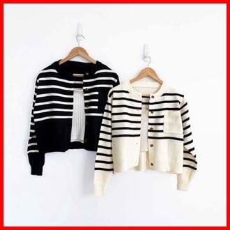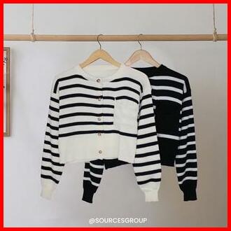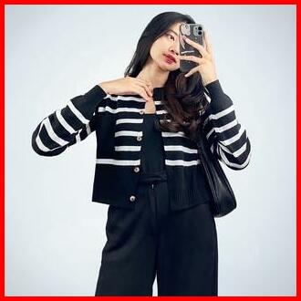 Emira Cardigan Rajut Setrip Santai Crew Neck Baju Fit Knitwear Atasan