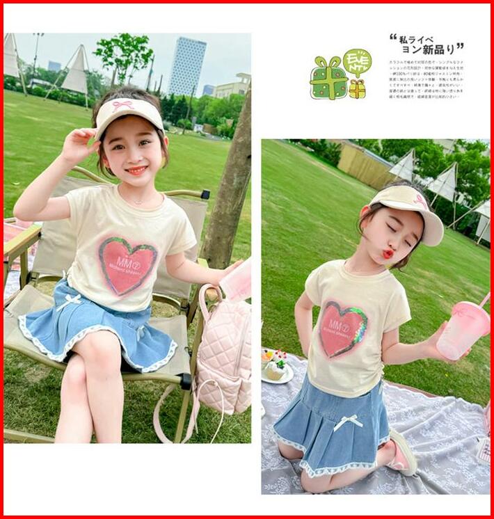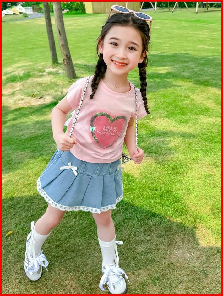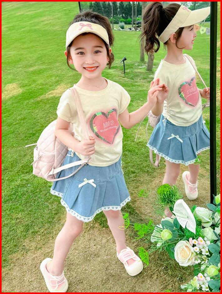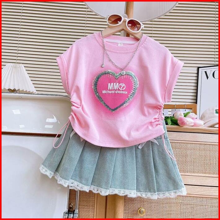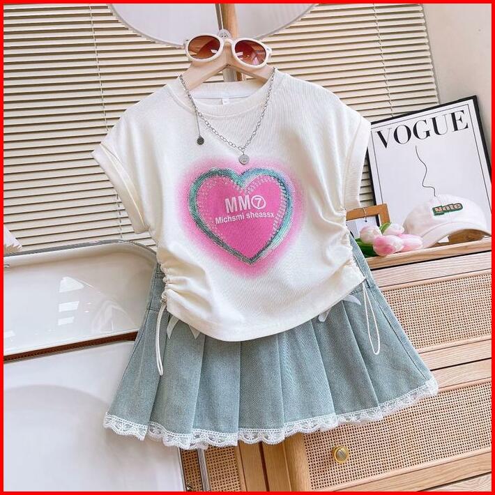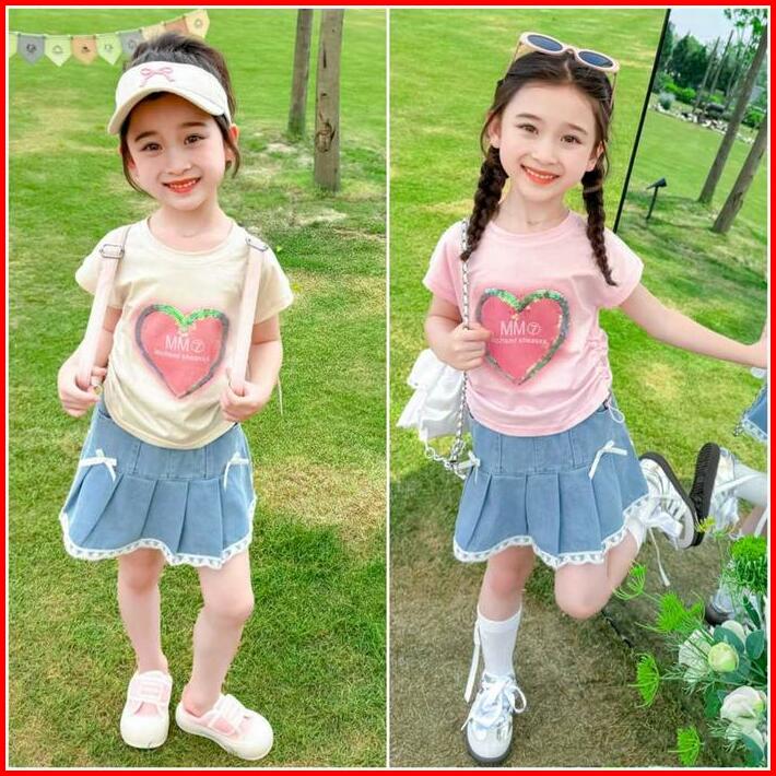 Kfo16-setelan Set Anak Korea Kaos Love Serut Samping Rok Jeans Pita