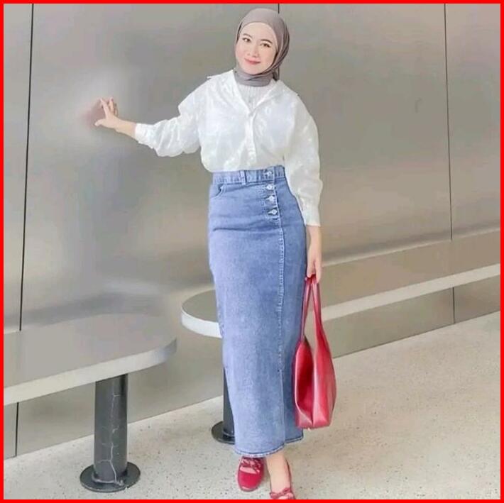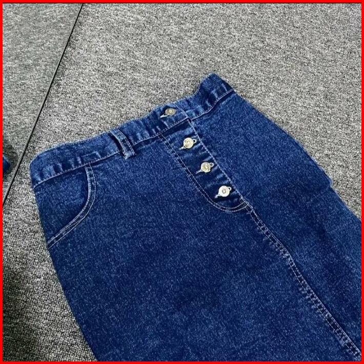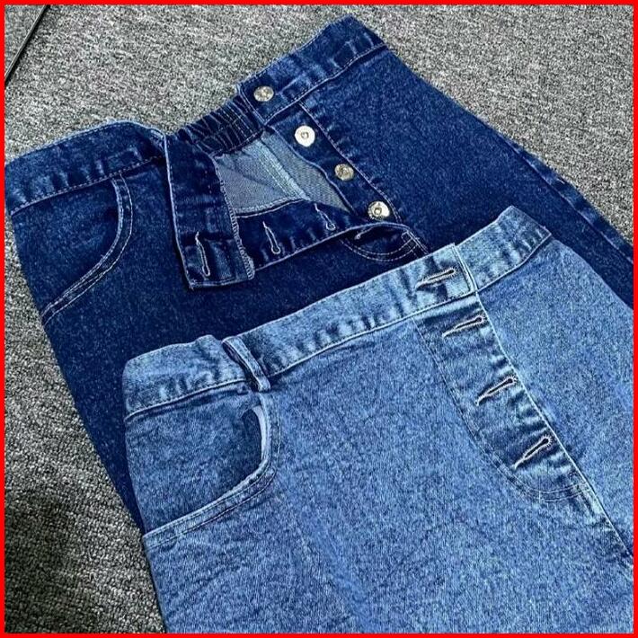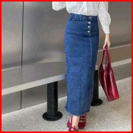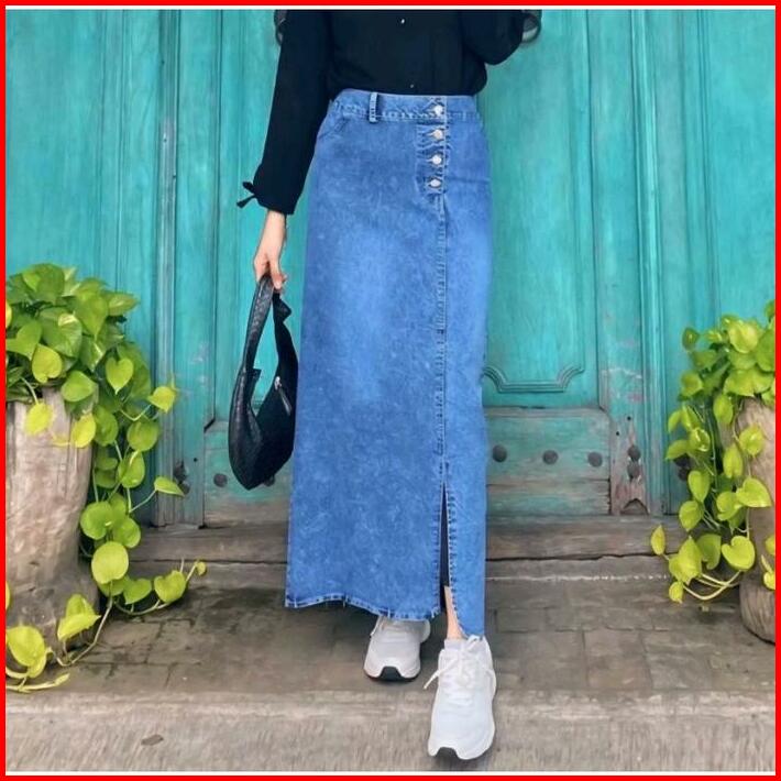 Rok Jeans Skirt Kancing Belahan Samping Panjang Casual Wanita Dewasa Standar Karet Rok Sobek Samping Pendek Midi