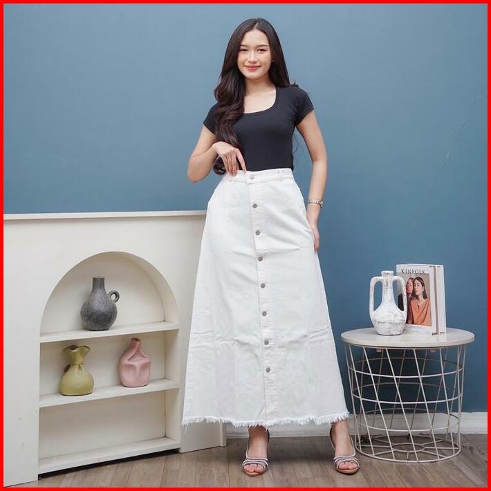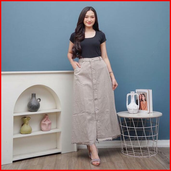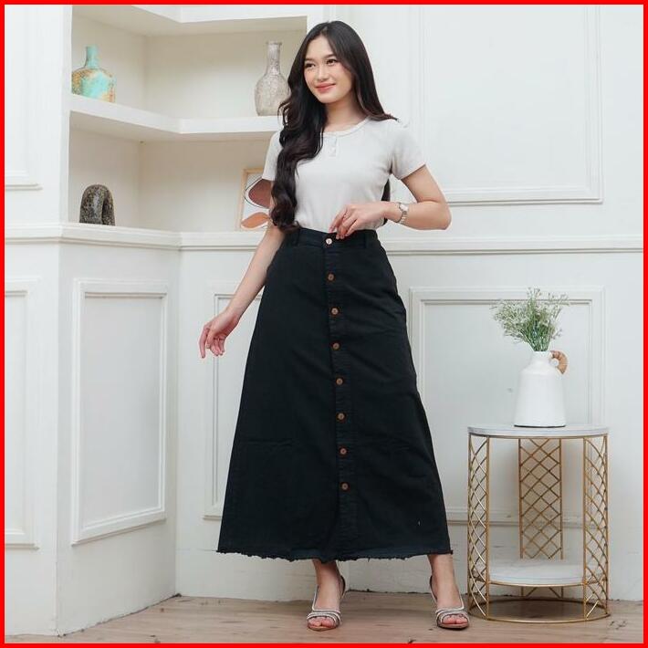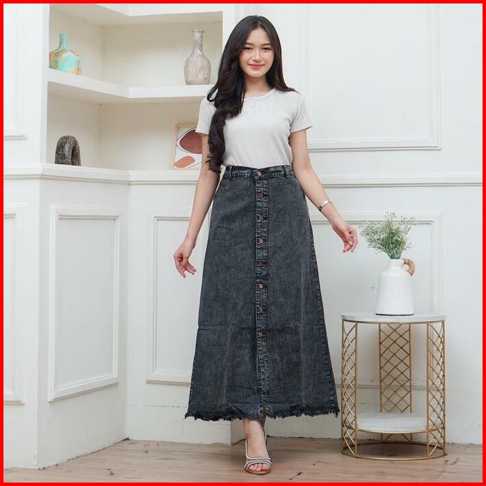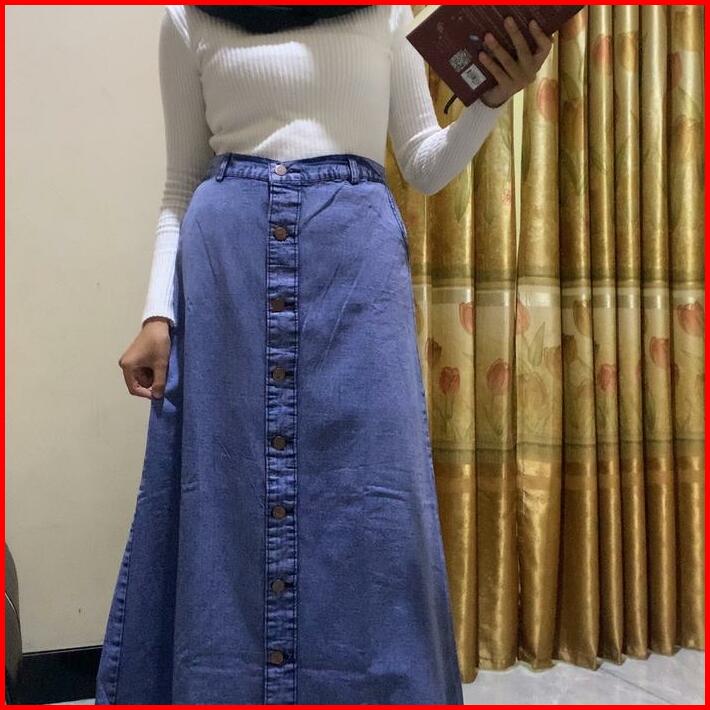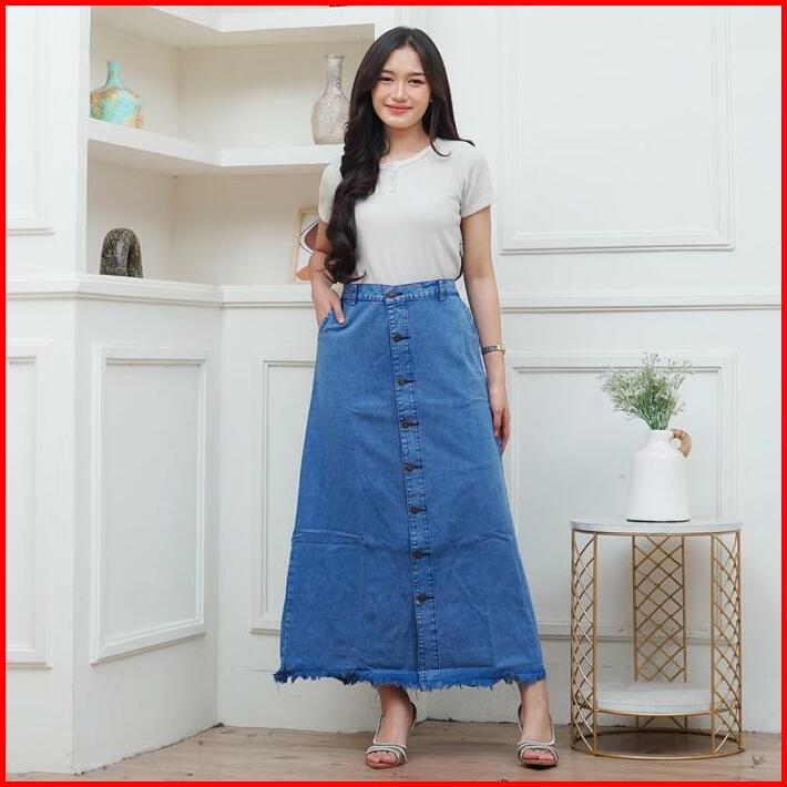 Rok Jeans Rawis Full Kancing Aktif A-line Polos Wanita Depan