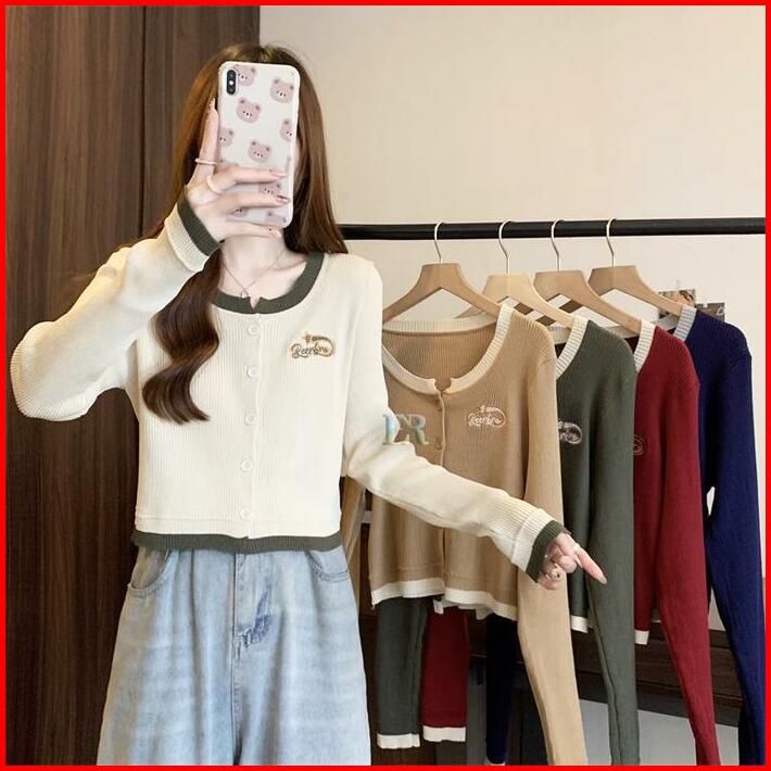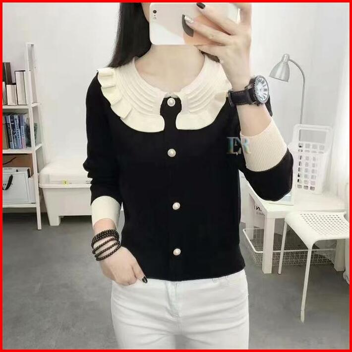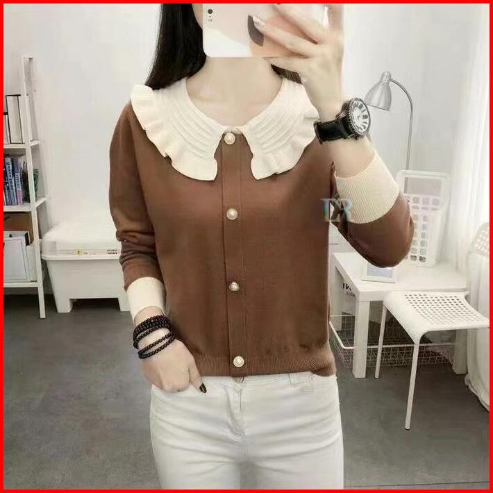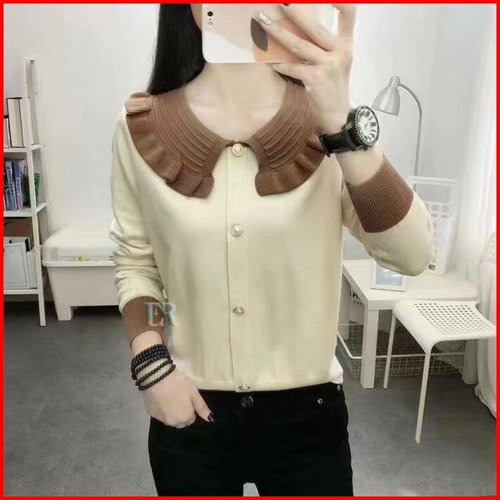 Lnr Shop Atasan Rajut Knit Lengan Panjang Dengan Ruffle Renda Full Kancing Blouse Kaos Kaus Sweater Baju Santai Jalan Po