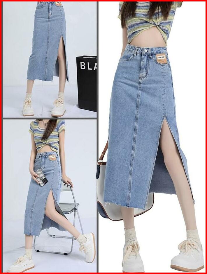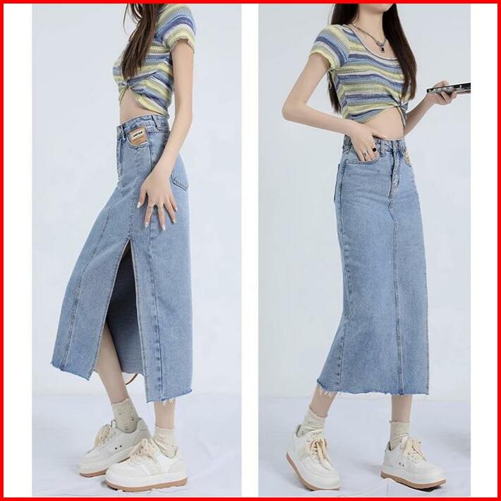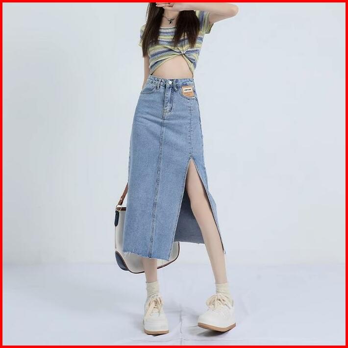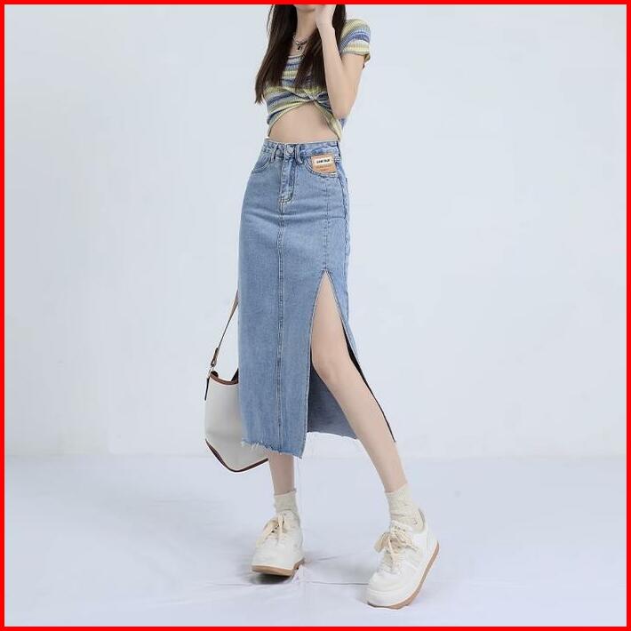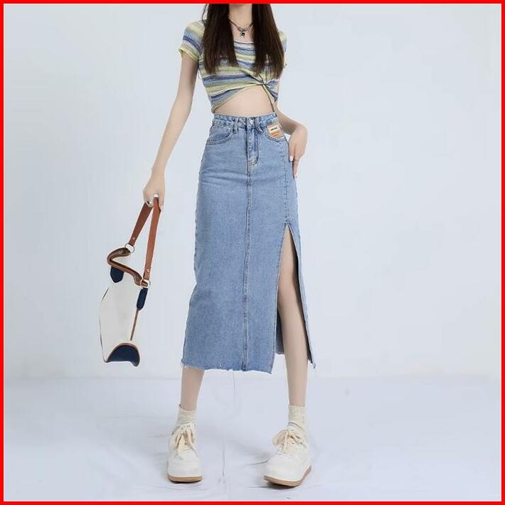Rok Jeans Midi Wanita Rok A-line Split Kasual Import