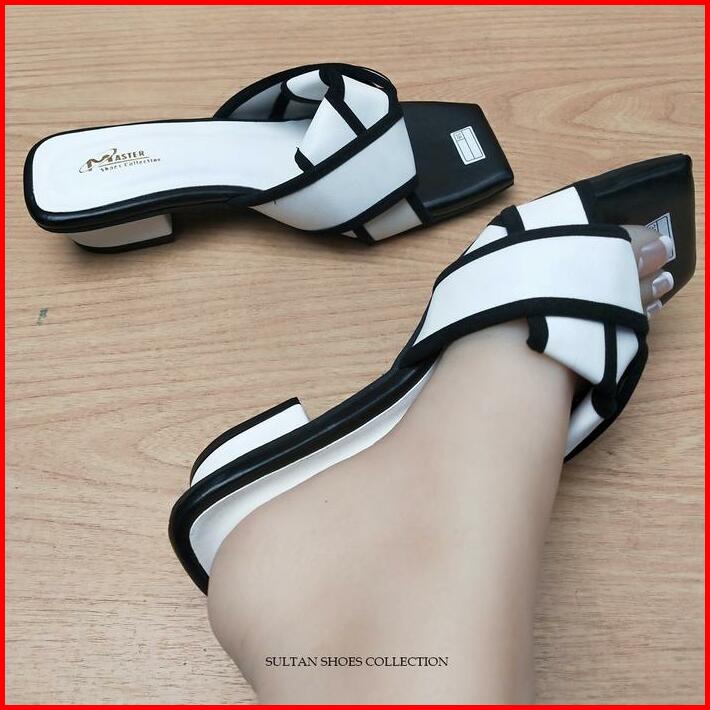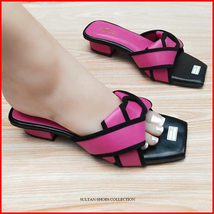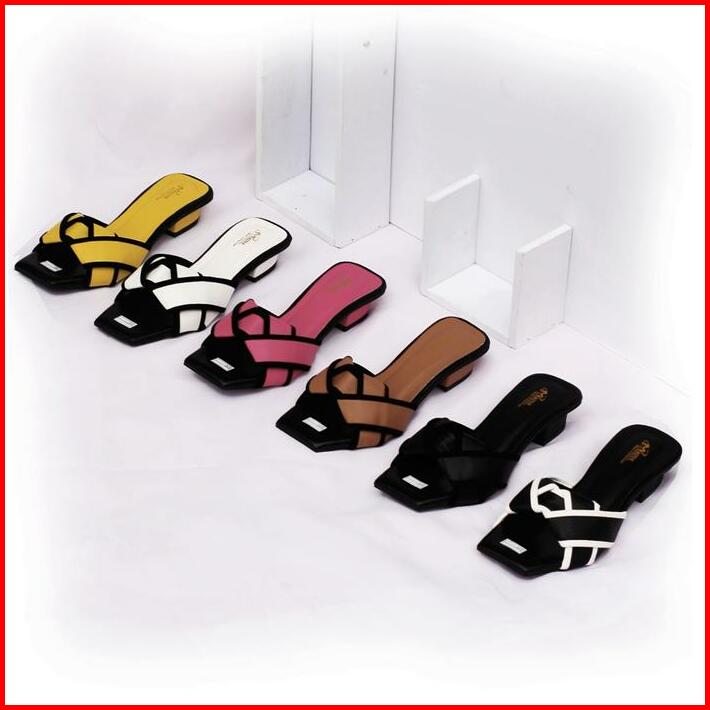 Sandal High Heel Wanita Remaja Ibu-ibu Tinggi 3 Cm Empuk Flat Slop Tali Silang Anyam Kombinasi Warna Hitam Platfrom Busa