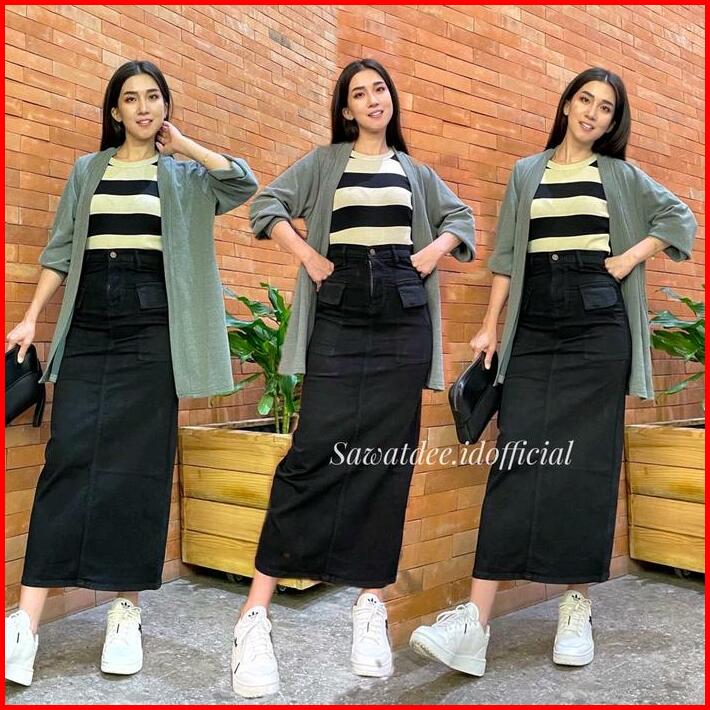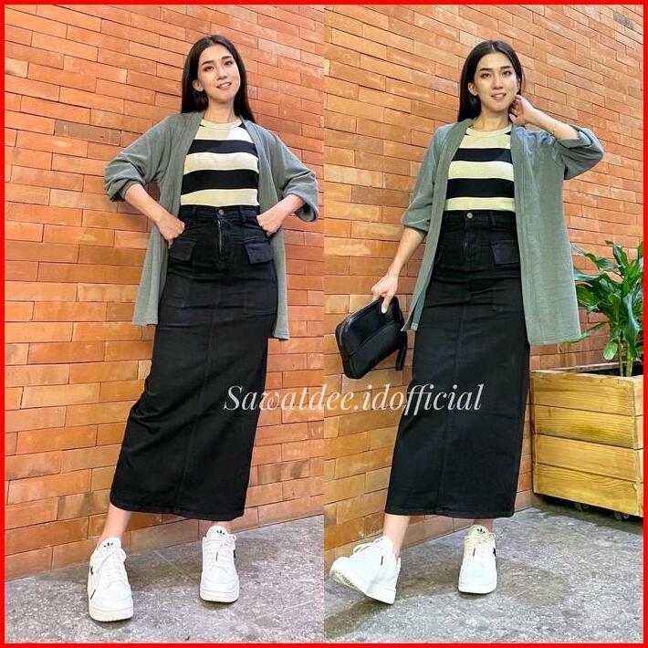 Rok Cargo Panjang Rok Span Panjang Rok Jeans High Waist Rok Span Melar Stretch Denim Wanita Biru