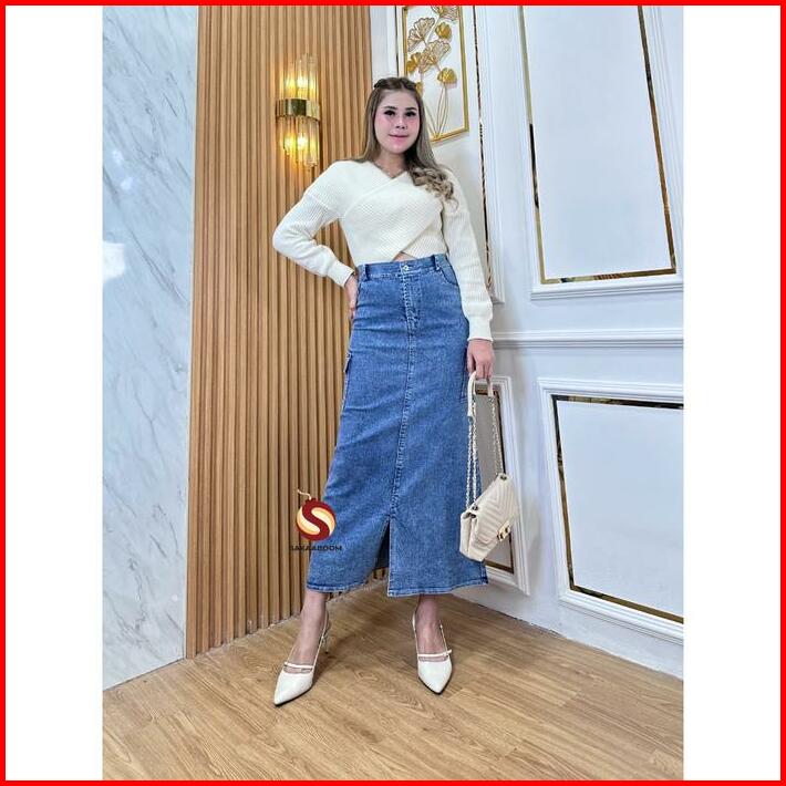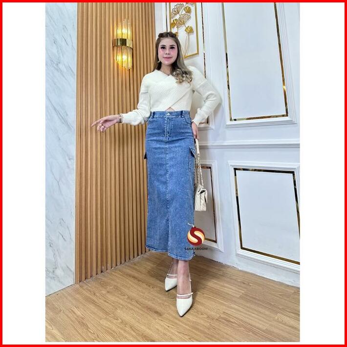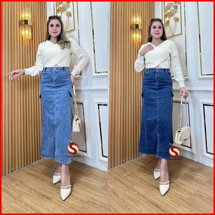 Sakaaboom Highwaist Rok Cargo Jeans Premium Bahan Stretchy Melar Pinggang Karet Kargo