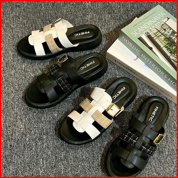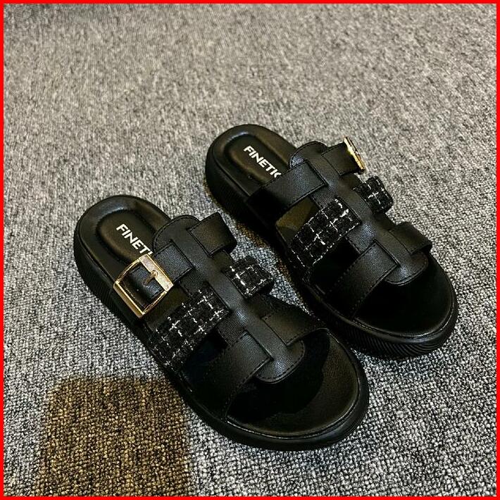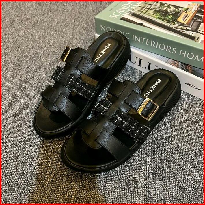 Sandal Finetic Slop Wanita Kekinian Rajut Sendal Wedges Hak Tinggi 3 Cm