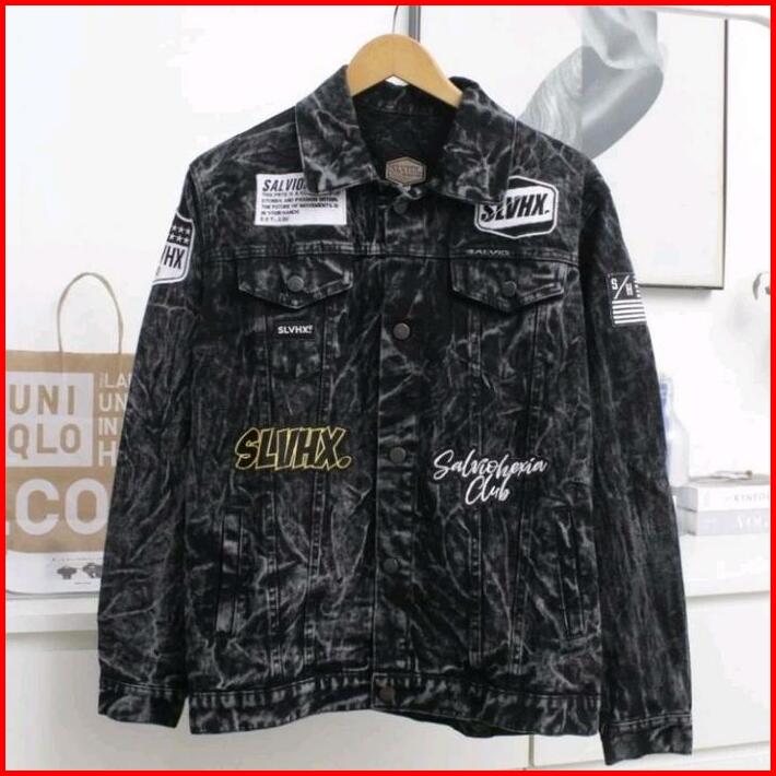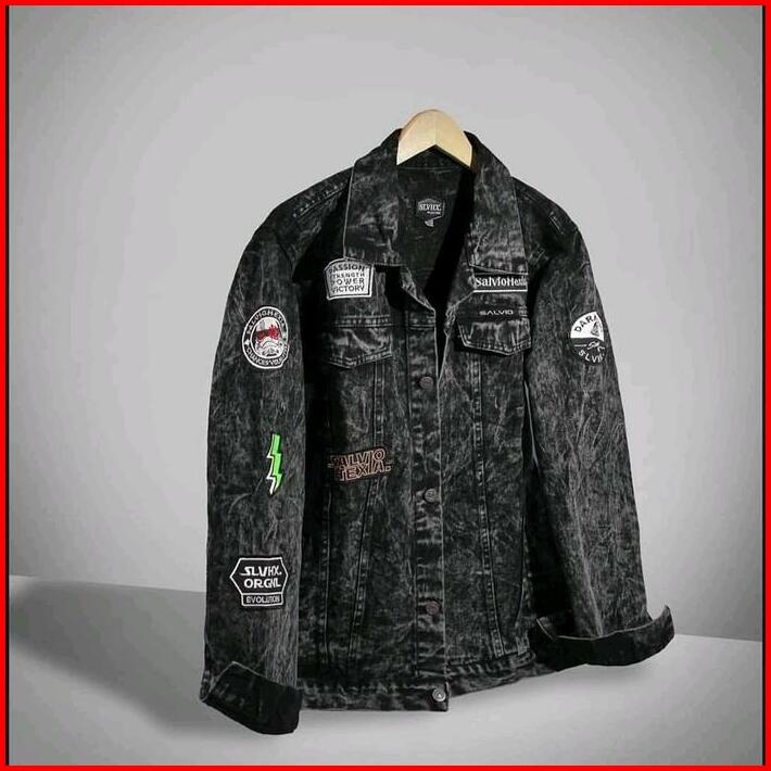 Jaket Jeans Pria Bordir Salviohexia Oversize Jaket Denim Cowok Hitam Jumbo Emblem Best Seller M-xxxl Terbaru Sandwash Te