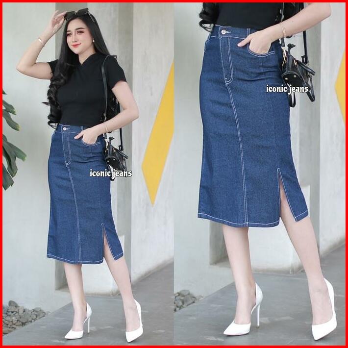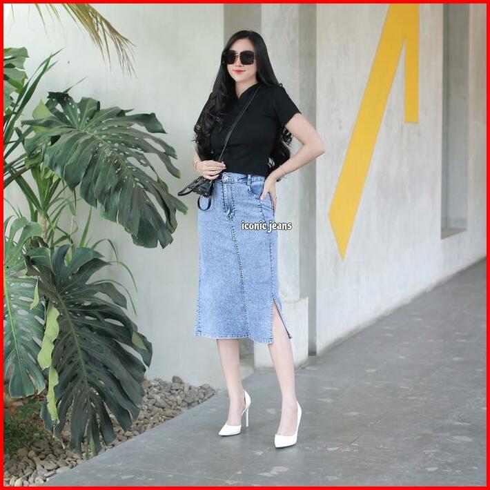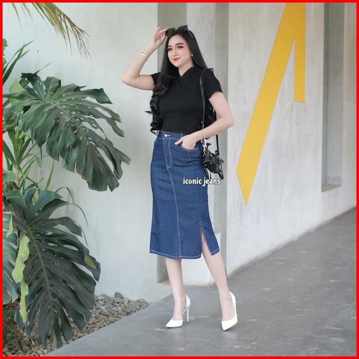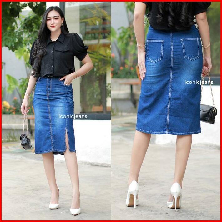 Nycta Jeans Skirt Rok Jeans Sepan Stretch Pinggang Karet Belah Samping Polos Slim-fitting Kancing Pendek Wanita