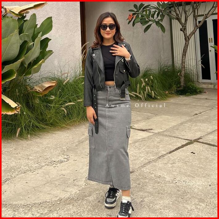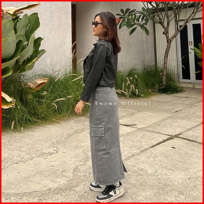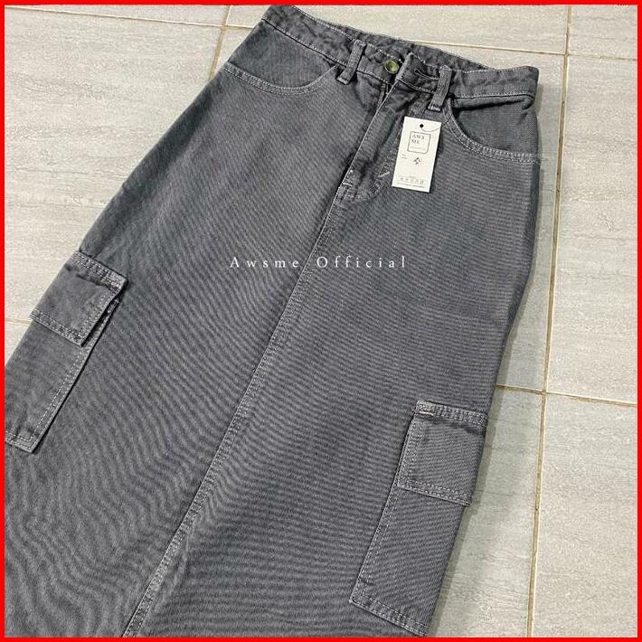 Rok Cargo Jeans Abu Celana Wanita Highwaist Midi Skirt Grey Korean