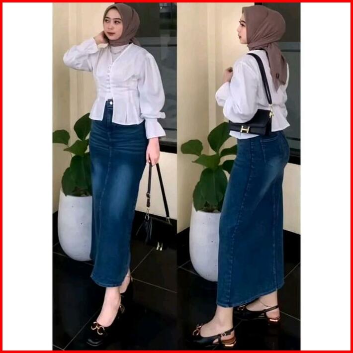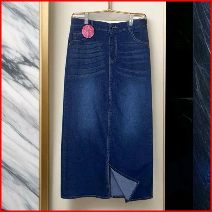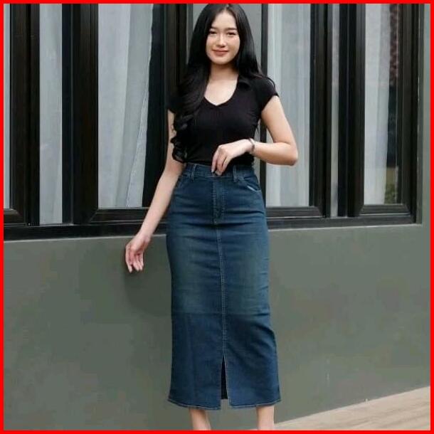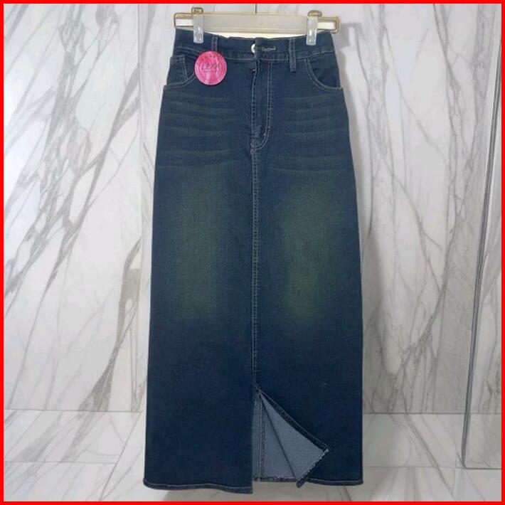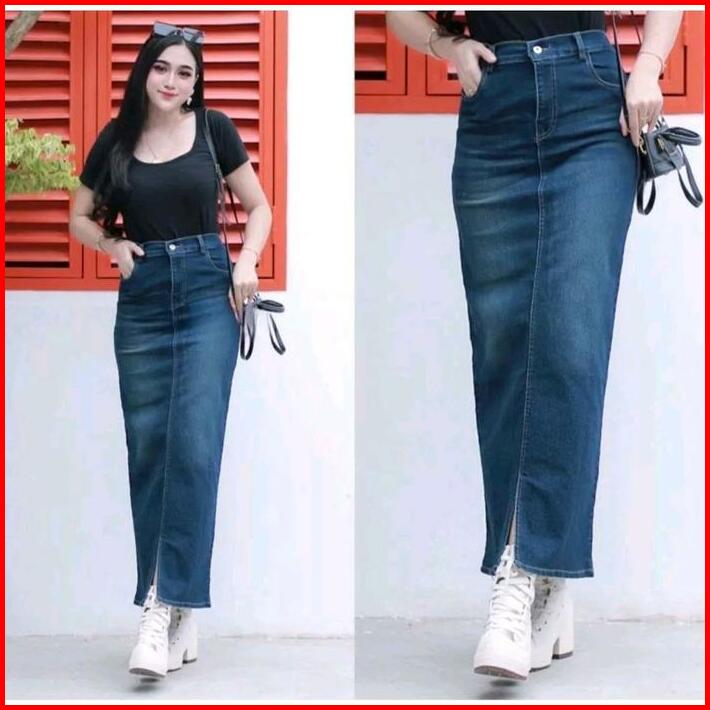 Rok Jeans Cessa Span Panjang Belah Depan Wanita Kancing Karet Samping Tebal Nyaman Hitam