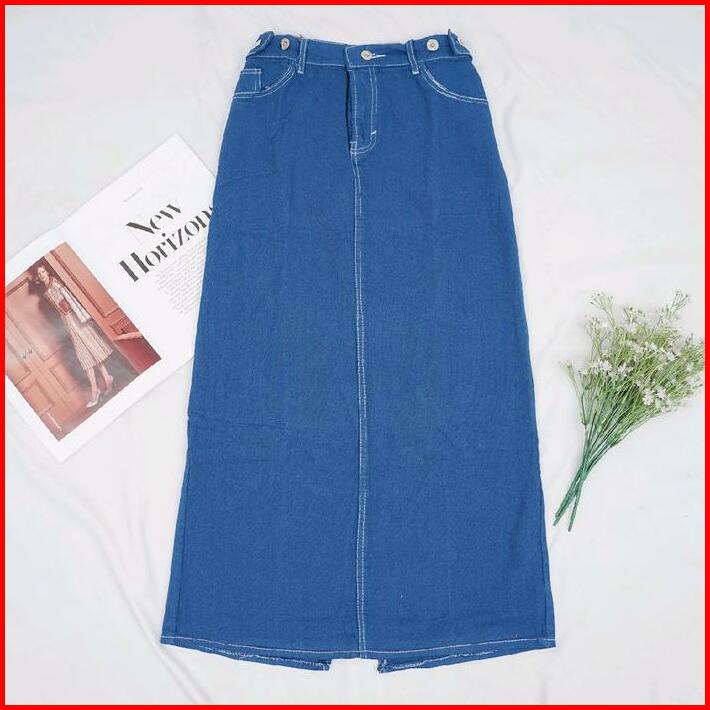 Rok Jeans Theana A-linen Panjang Wanita Dewasa Standar Formal Nyaman Dan Tebal Variasi Kancing Depan Karet Denim