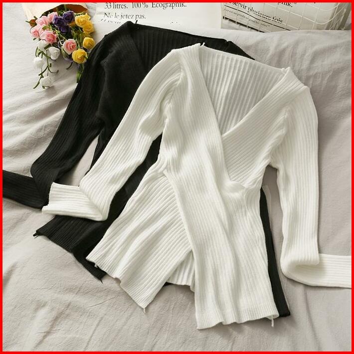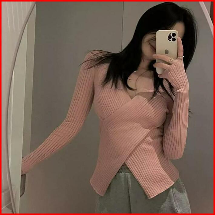 Baju Sweater Wanita V-neck Gaya Korea Knit Wrap Top Polos Lengan Panjang Wanita Rajut Korea Style Vv Sweater Knitwear At
