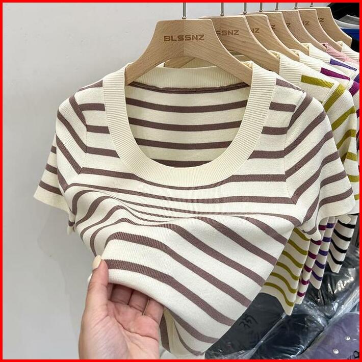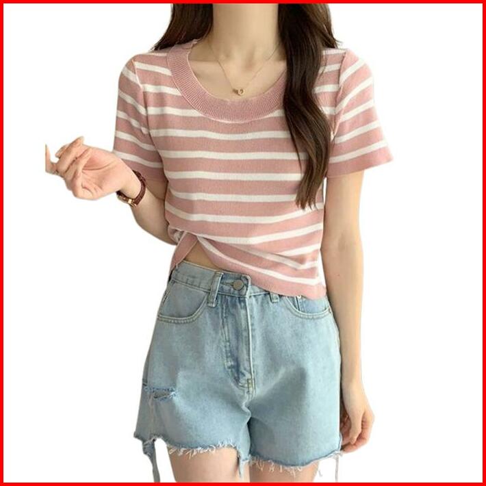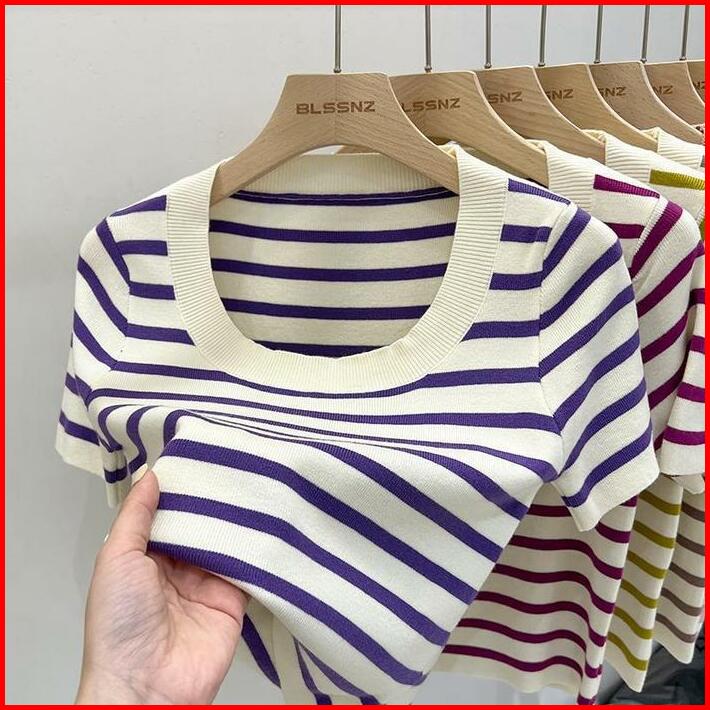Atasan Knit Wanita Stripe Lengan Pendek Atasan Rajut Salur Wanita Baju Garis Knitwear Panjang Bulat