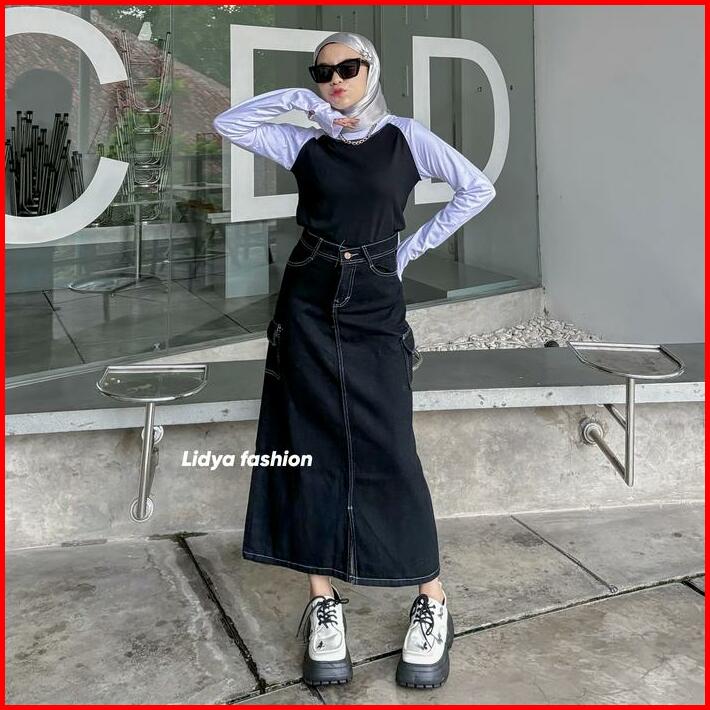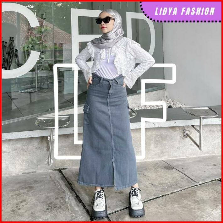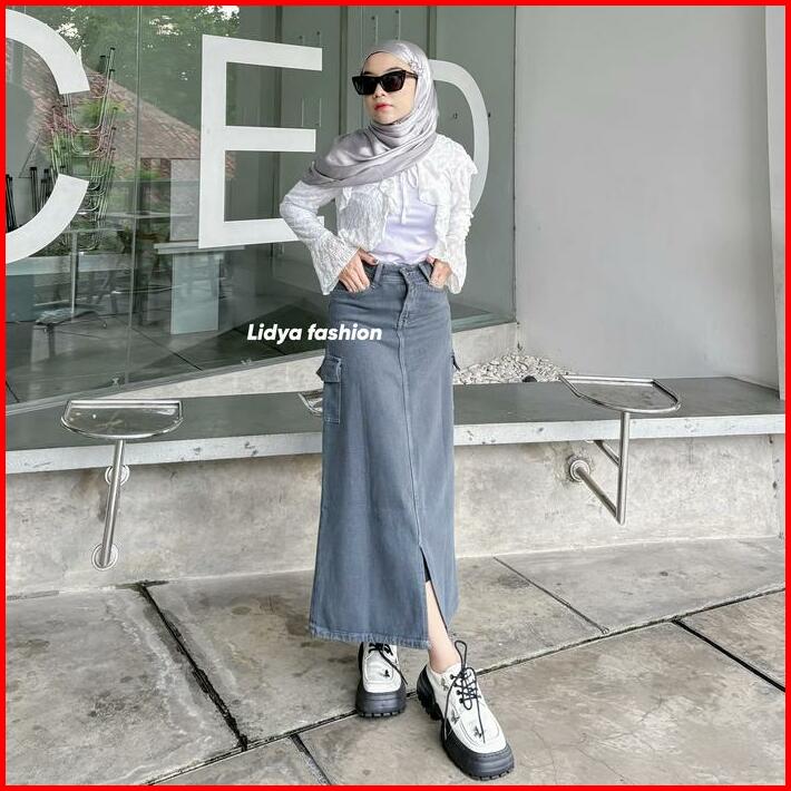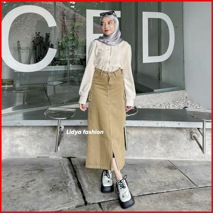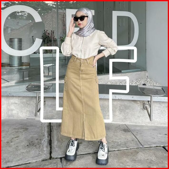 Highwaist Rok Jeans Cargo Panjang Wanita