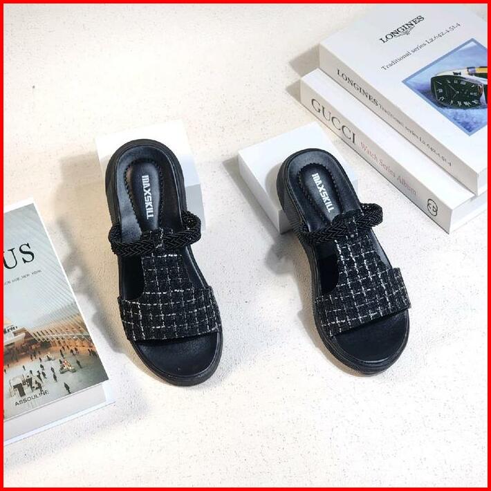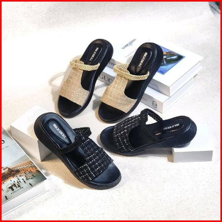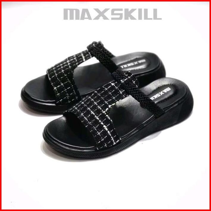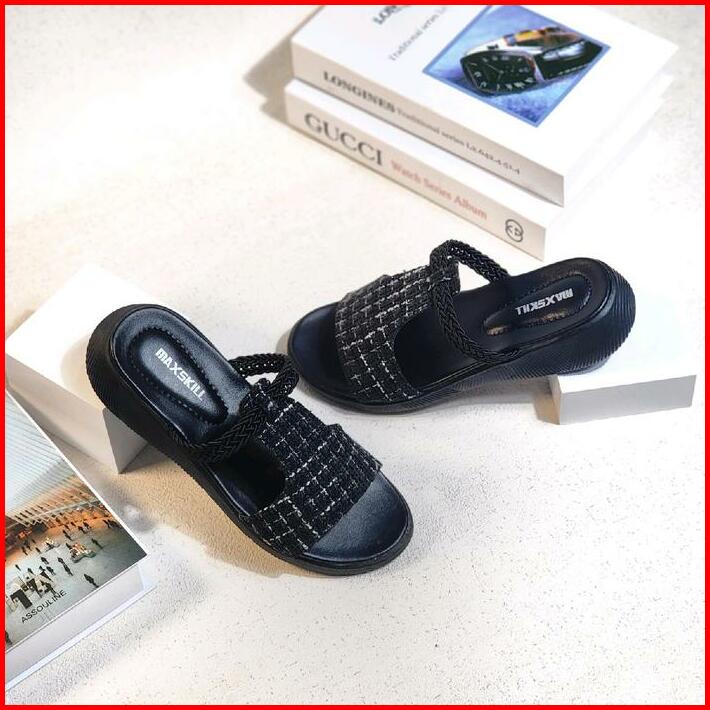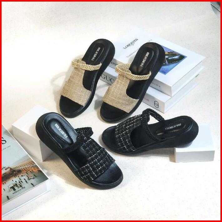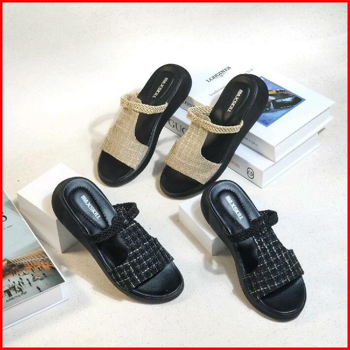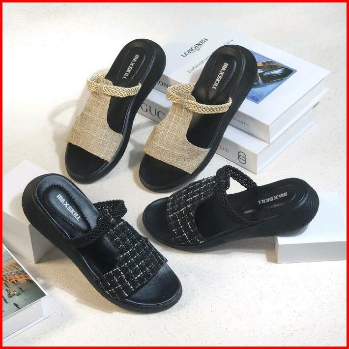 Maxskill Bertha Sandal Slop Korean Style Sandal Slipper Sandal Wanita Wedges Kekinian Slop Size 37-40 Hitam Sendal Cewek