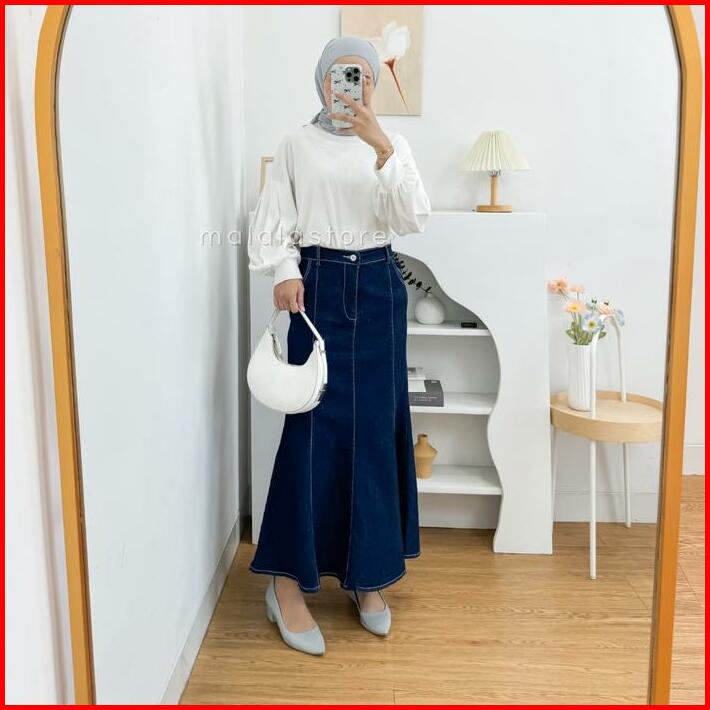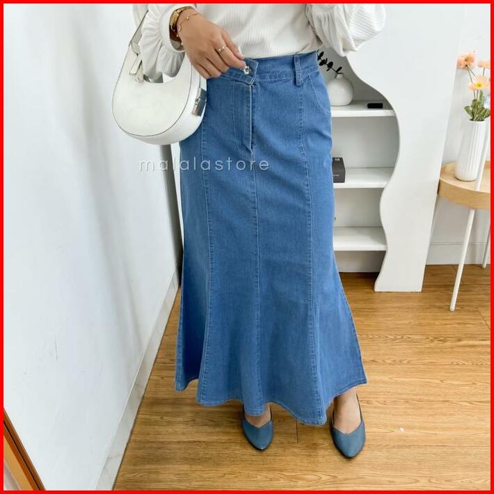 Rok Vanesa Jeans Wanita Duyung Skirt Mermaid Denim Premium Melar Stretch Cewek Kancing Karet Panjang