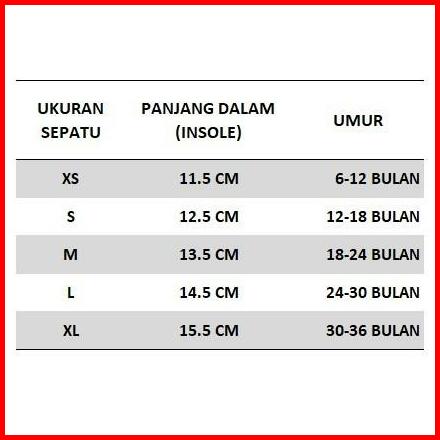 XS (6-12 BULAN), S (12-18 BULAN), M (18-24 BULAN), L (24-30 BULAN), XL (30-36 BULAN)