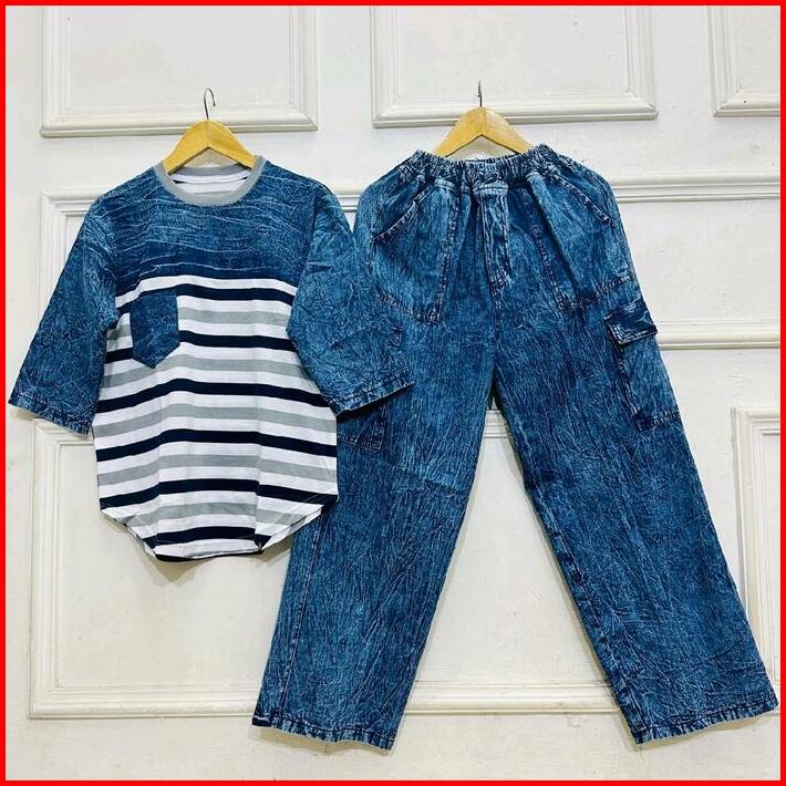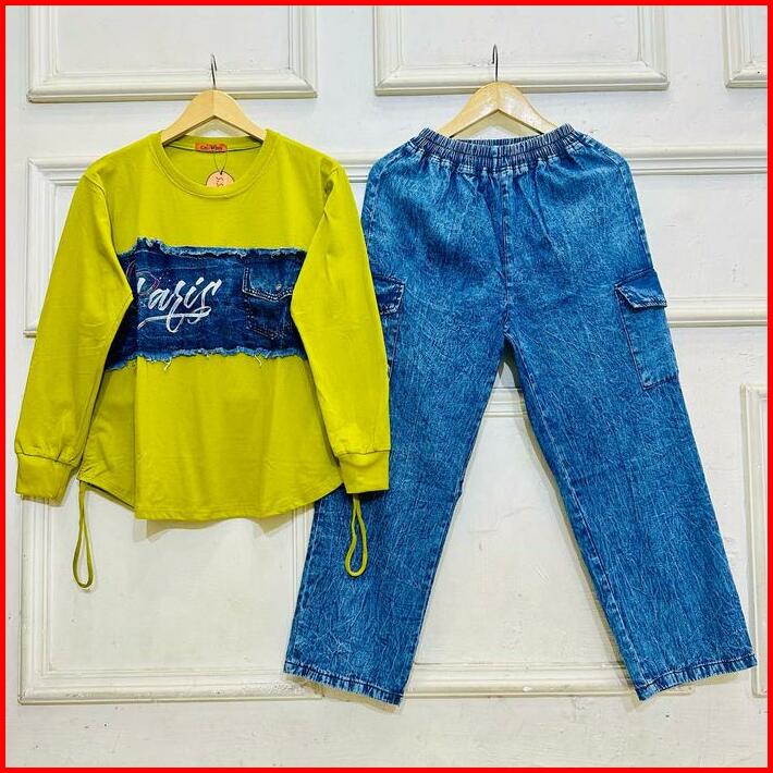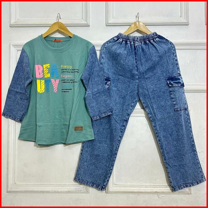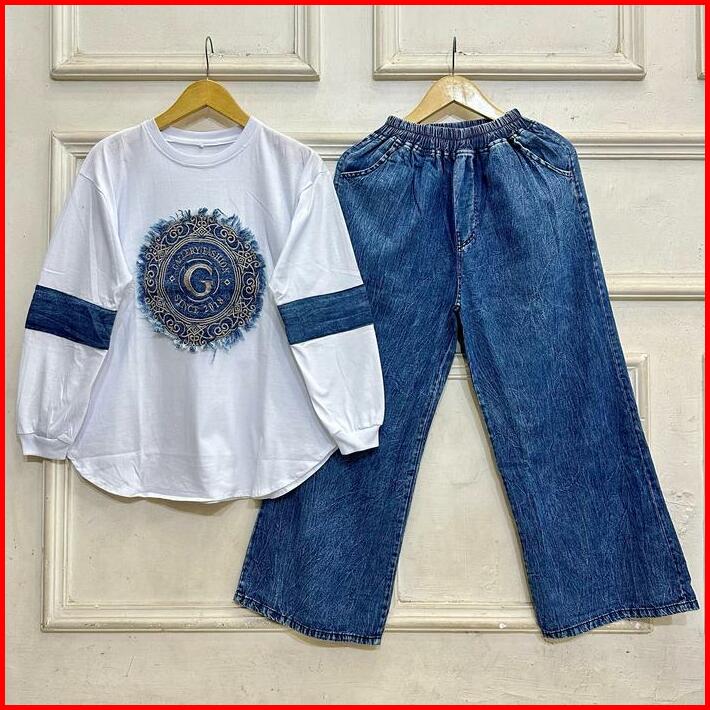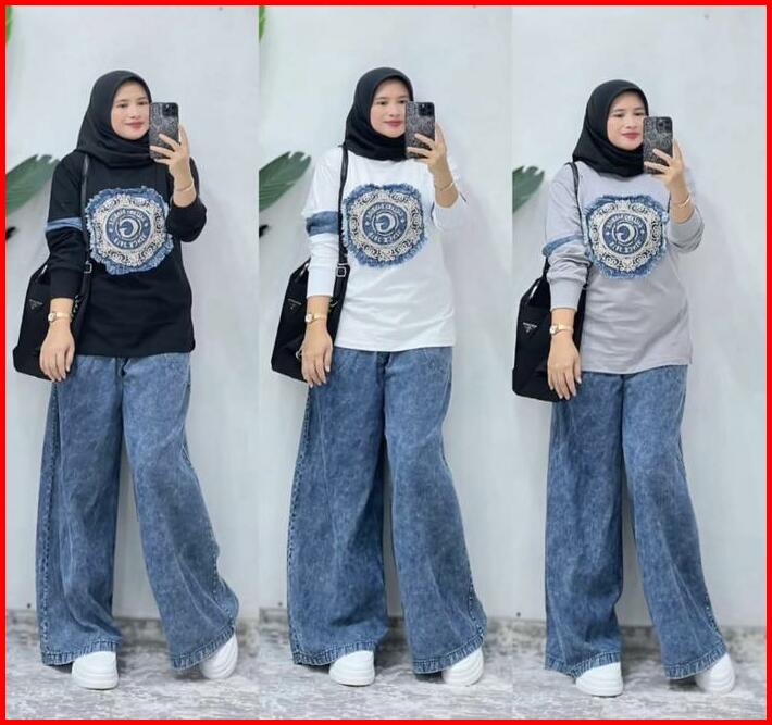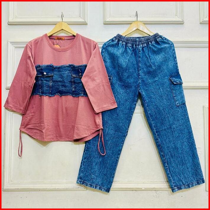 Exris Linen Motif Setelan Wanita Dewasa Atasan Baju Kaos Combed Mix Jeans