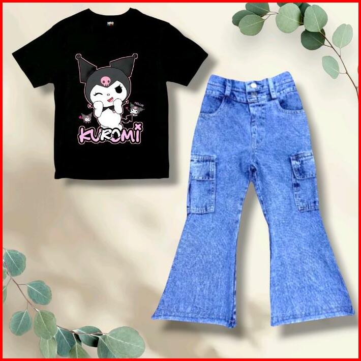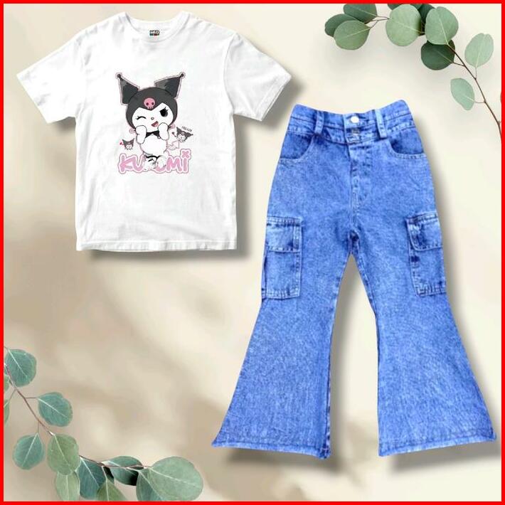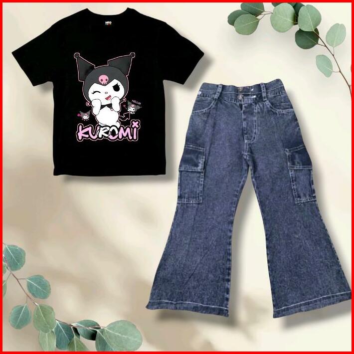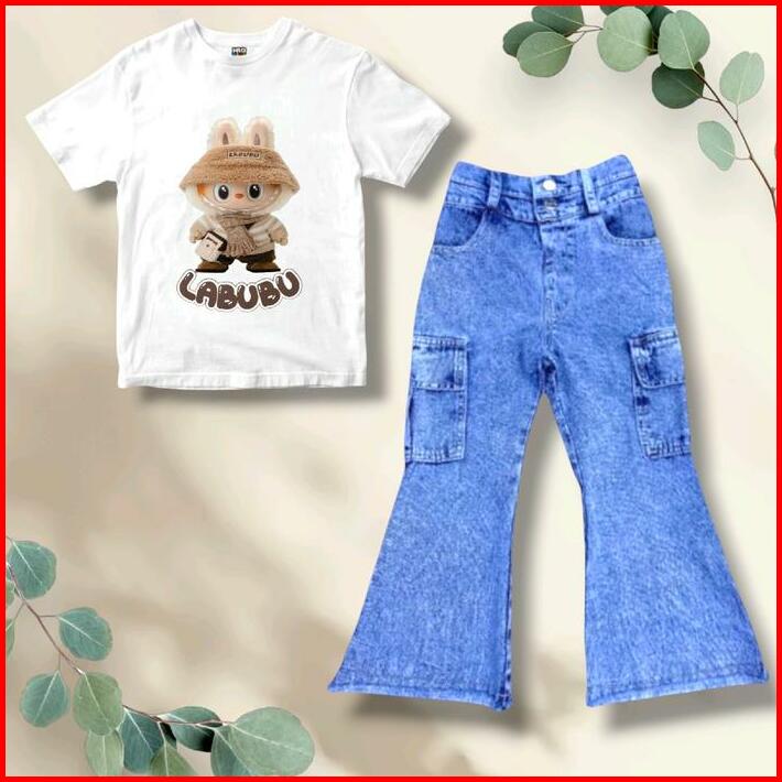 Setelan Baju Motif Labubu Celana Cutbray Cargo Anak Perempuan Usia 2-7 Tahun
