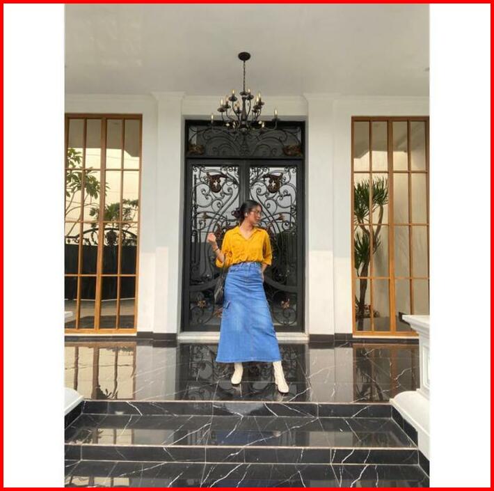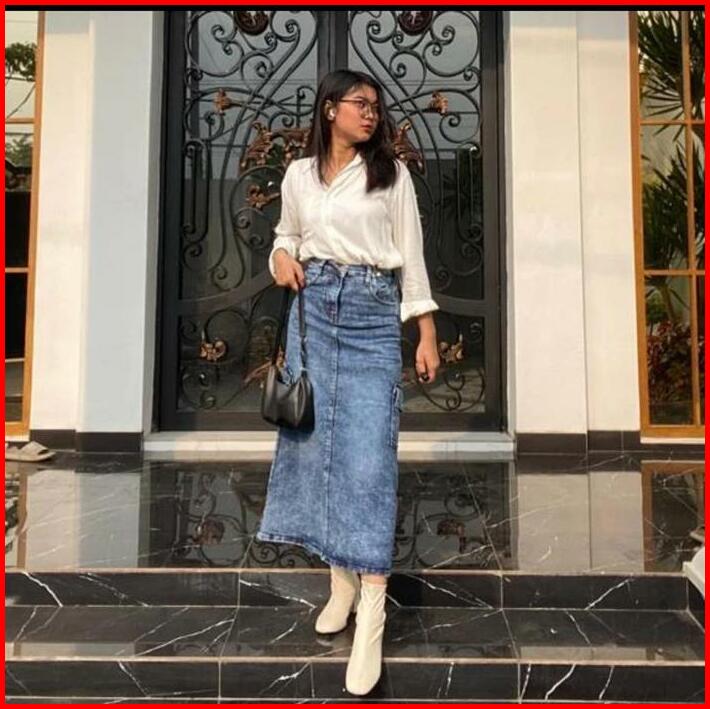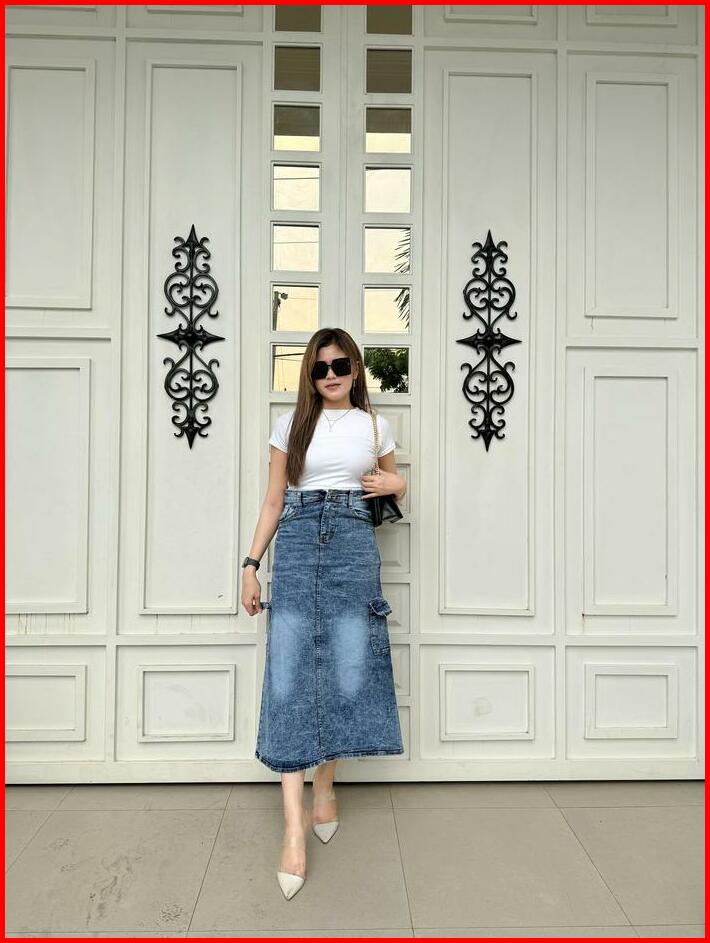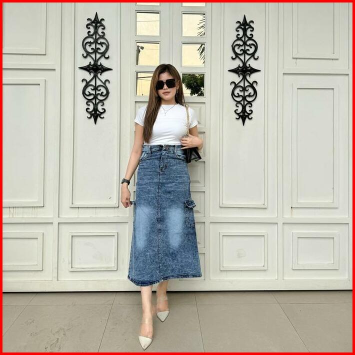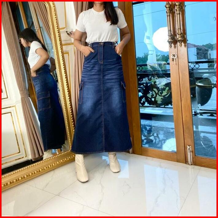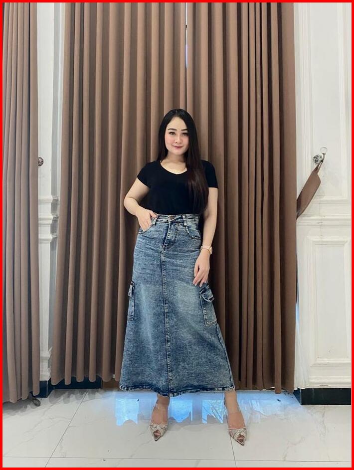 Rok Jeans Cargo Panjang Strech Big Size 27-42 Tebal Wanita