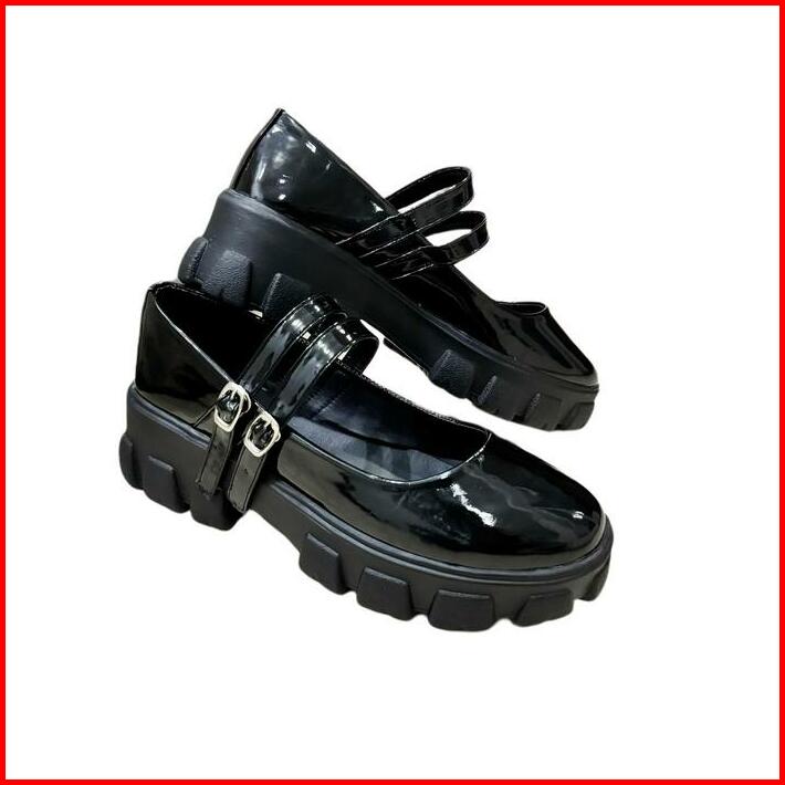 Sepatu Oxford Wanita Hitam Pricy Double Gesper Hak Datar 5 Cm Flat Shoes Docmart Black Cewek Ootd Kekinian Premium Quali
