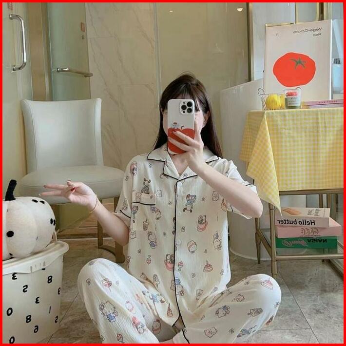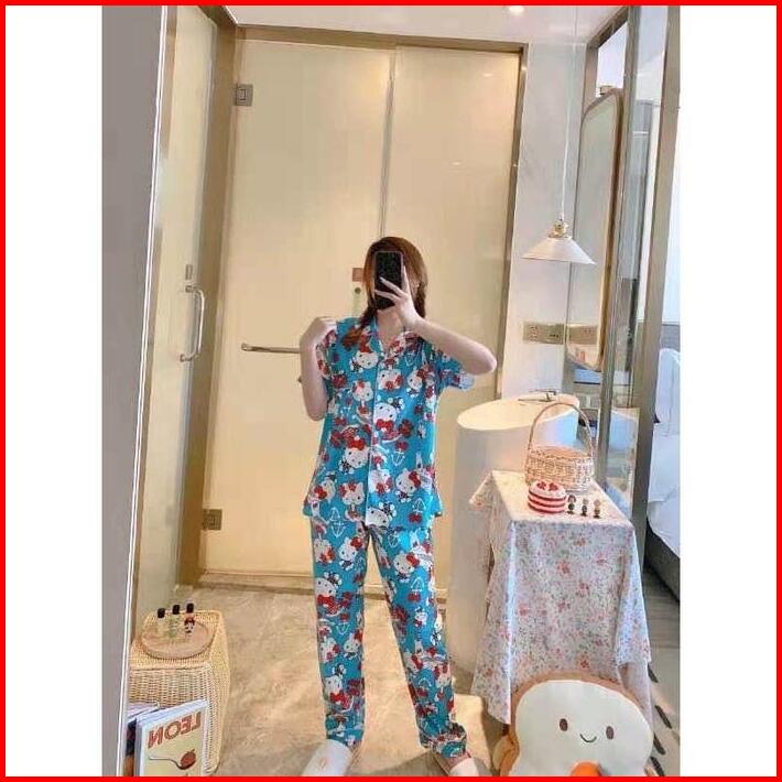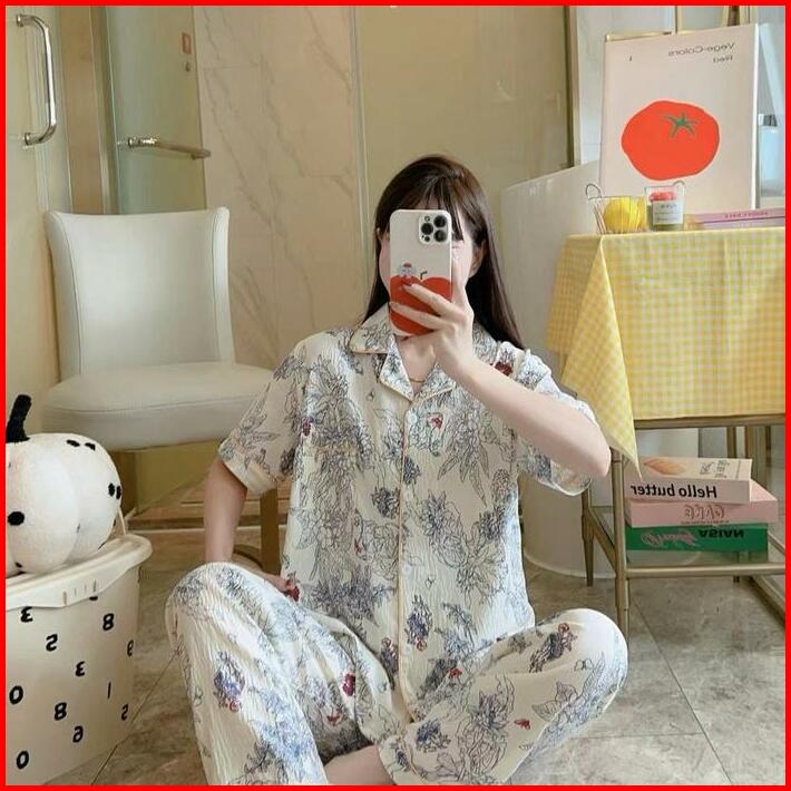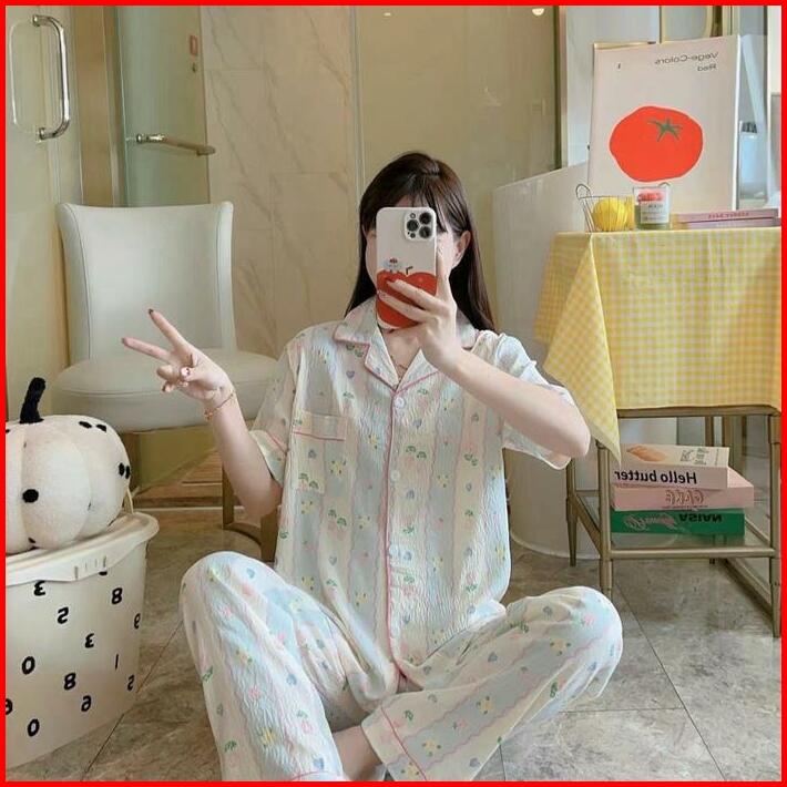 Markas Fashion99 Piyama Lengan Pendek Celana Panjang Kancing Murah Setelan Baju Tidur Katun Lembut Wanita Dewasa Motif
