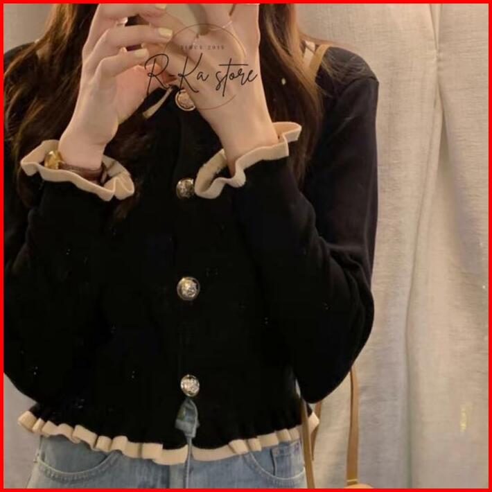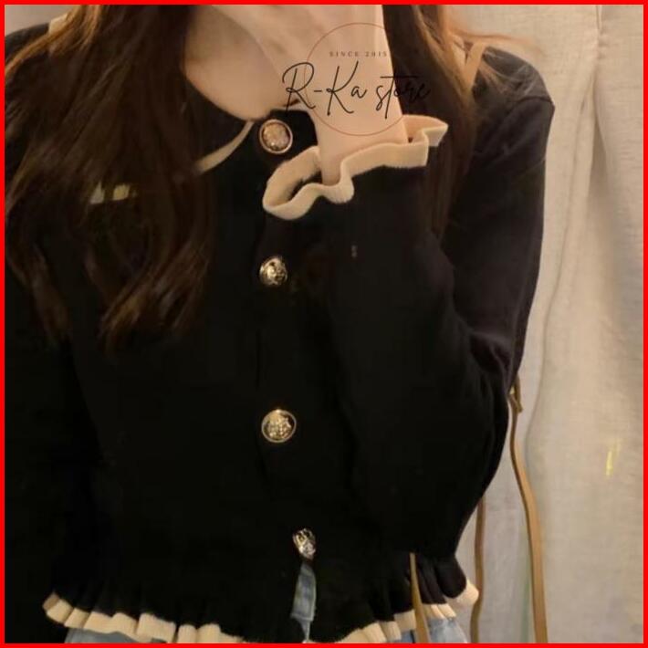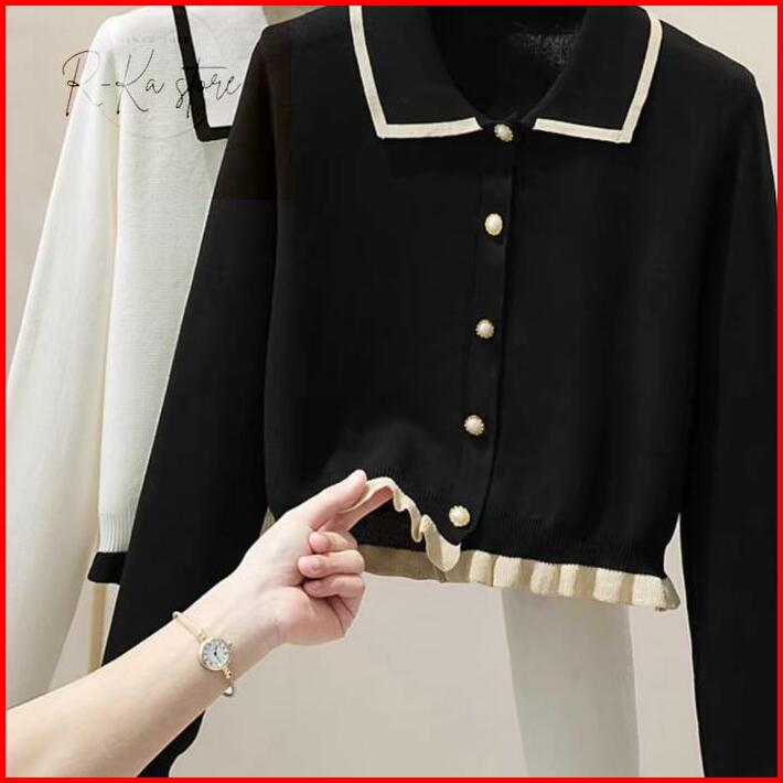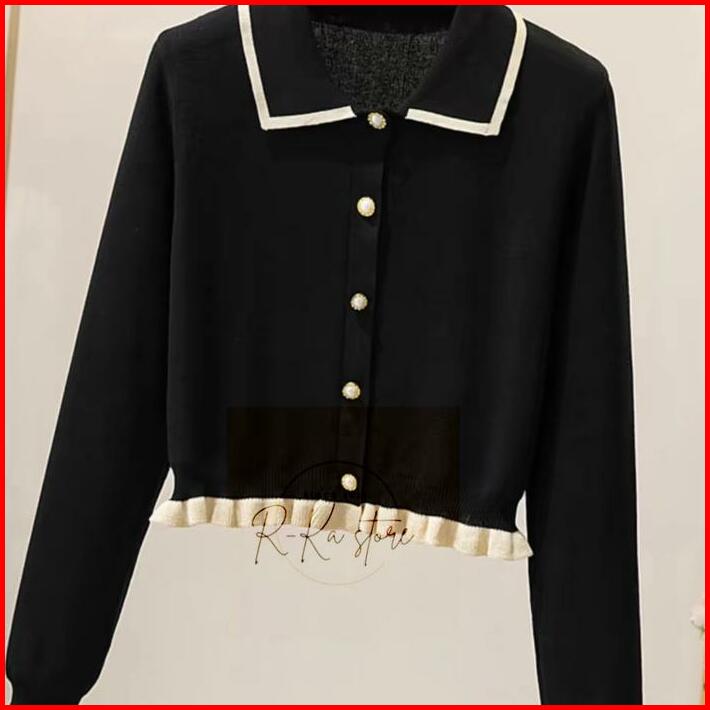 Switter Rajut Crop Atasan Rajut Berkerah Hitam Putih Premium Knitwear Cardigan Outer Top Baju Kancing Tangan Kardigan Te