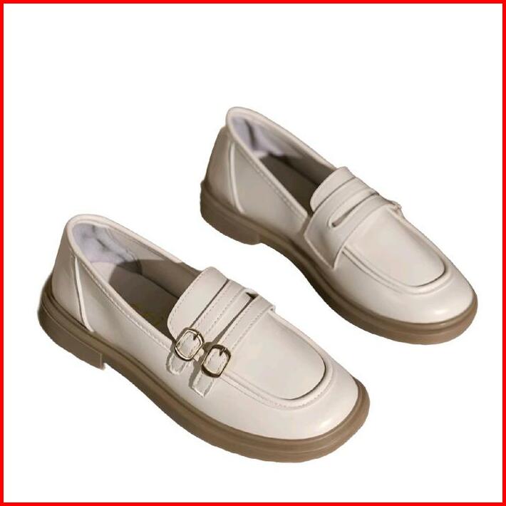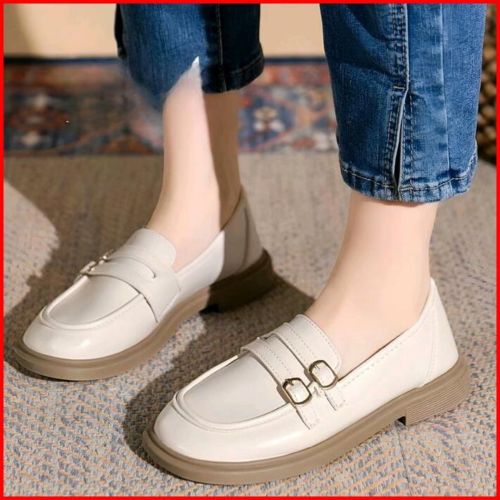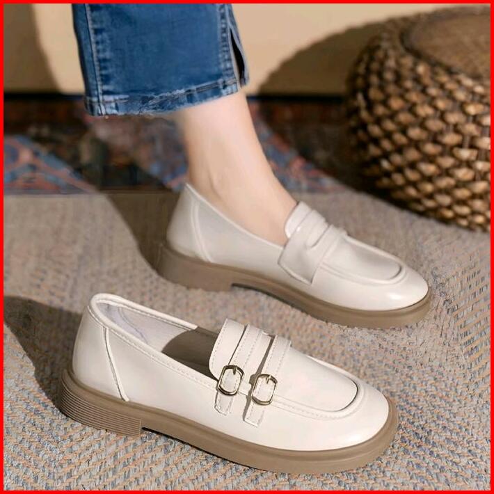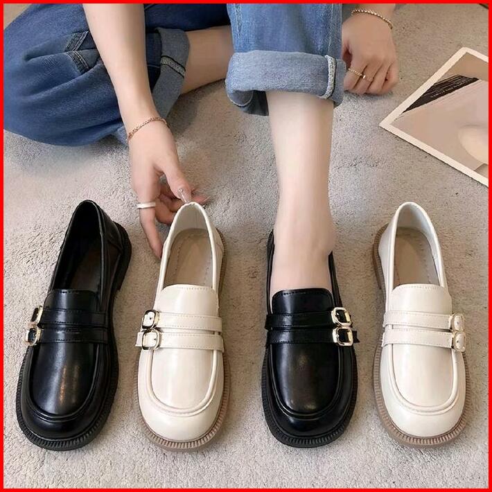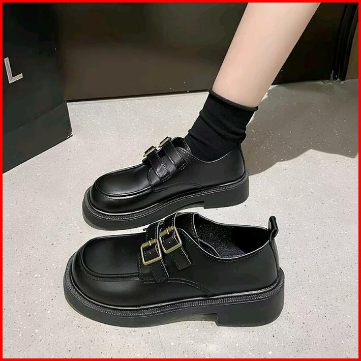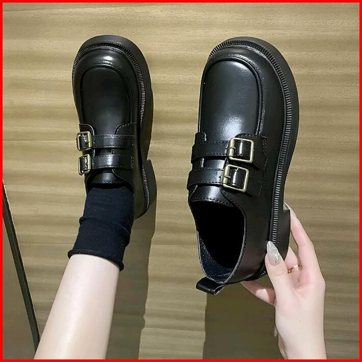 Sepatu Docmart Wanita Double Gesper Slip On Hak Datar Hitam Flat Shoes Oxford Ootd Viral Remaja Cewek Musim Panas Black
