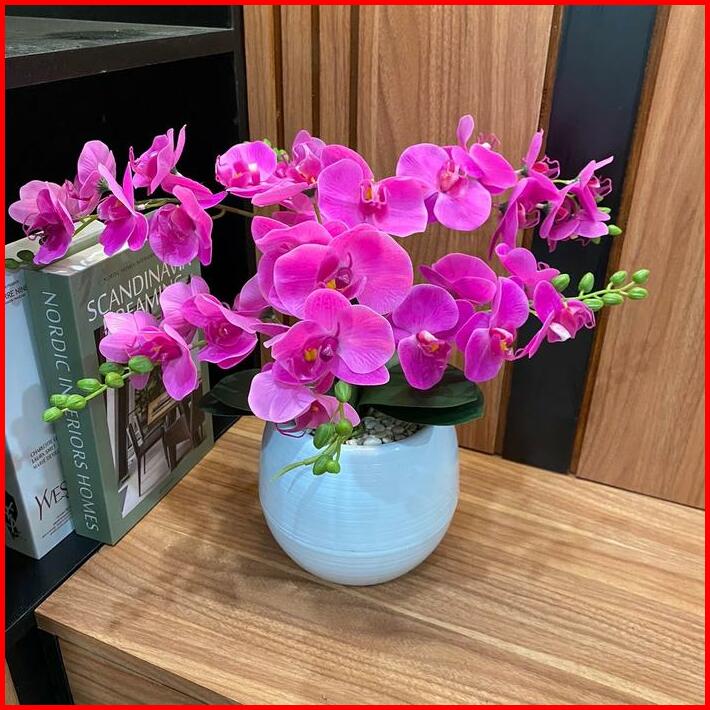 Anggrek Hias Meja Premium 6 Cabang Latek Film Set Vas Pot Bola Dekorasi Bunga Purple Pelastik Kamar Mandi