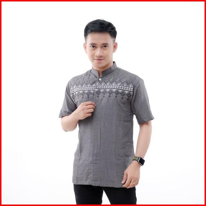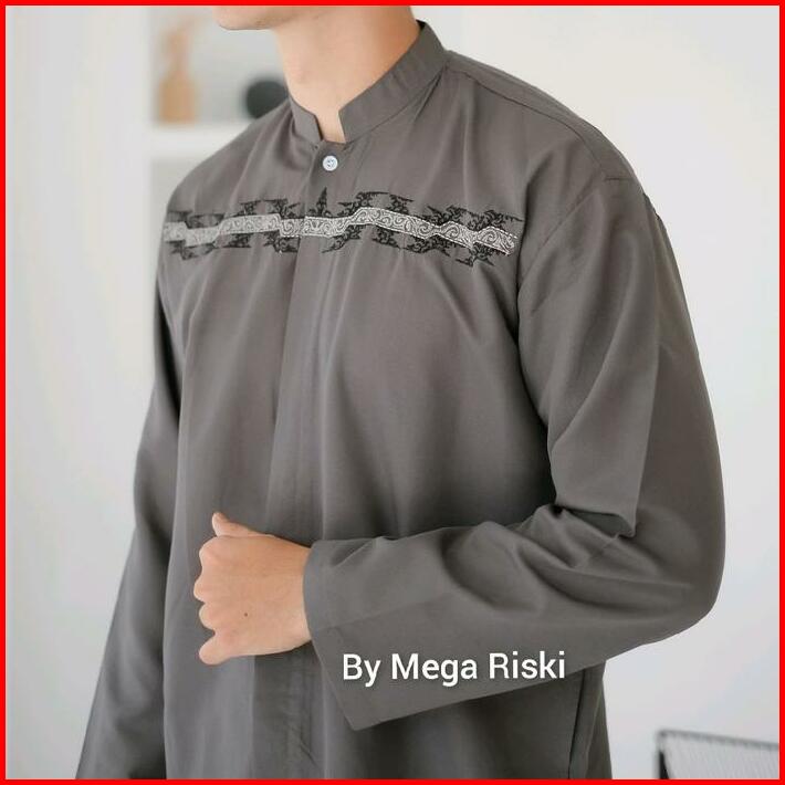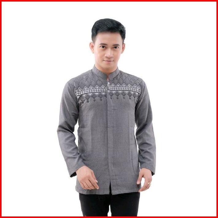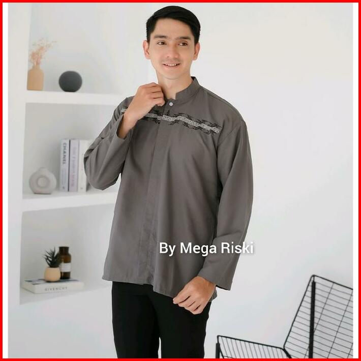 Baju Koko Lengan Panjang Warna Abu Motif Ikhsan Bordir Katun