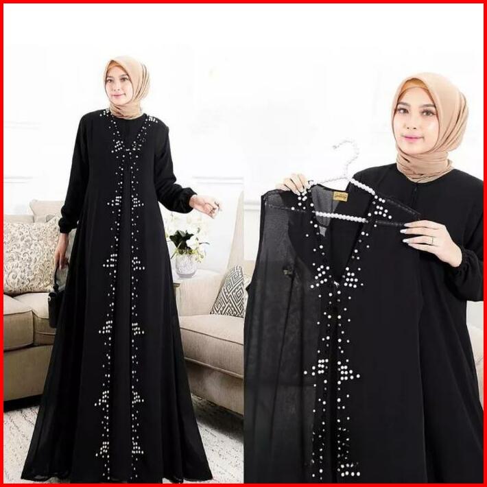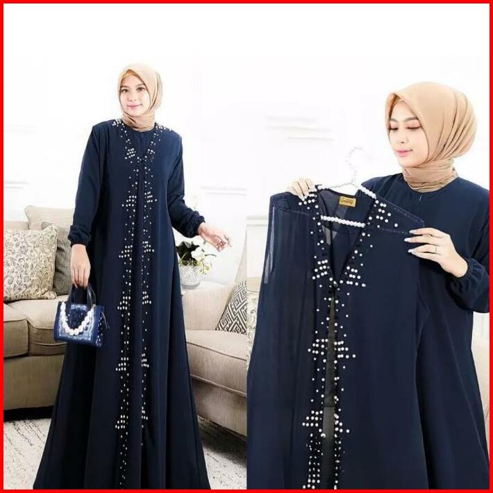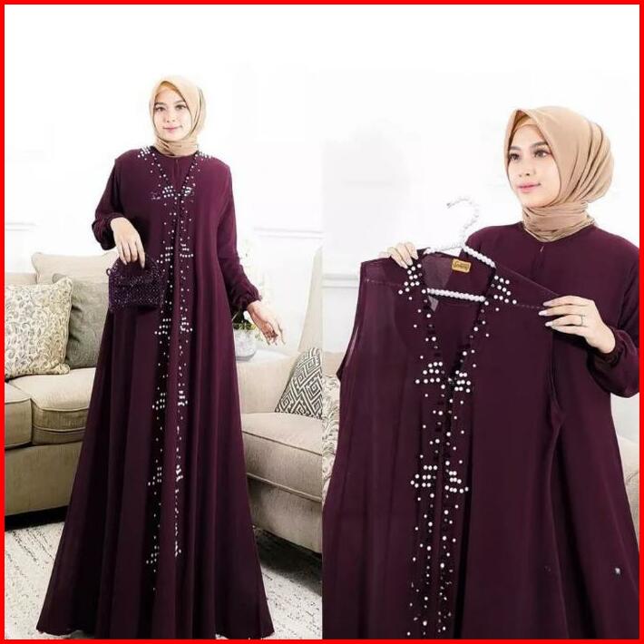 New Rebeca Set Dress Kondangan Setelan Gamis Outer Panjang Ceruty Babydoll Aksen Mutiara Termurah Baju Muslim Wanita Kek