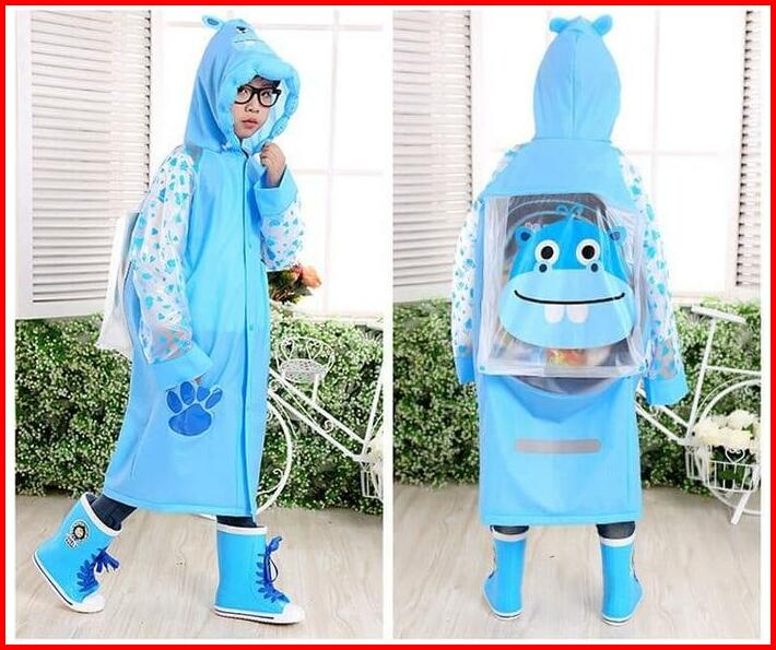 Kids Jas Hujan Anak Motif Biru Kuda Nil Dengan Ruang Ransel Pvc