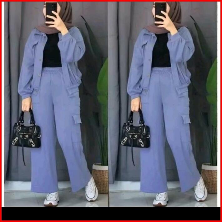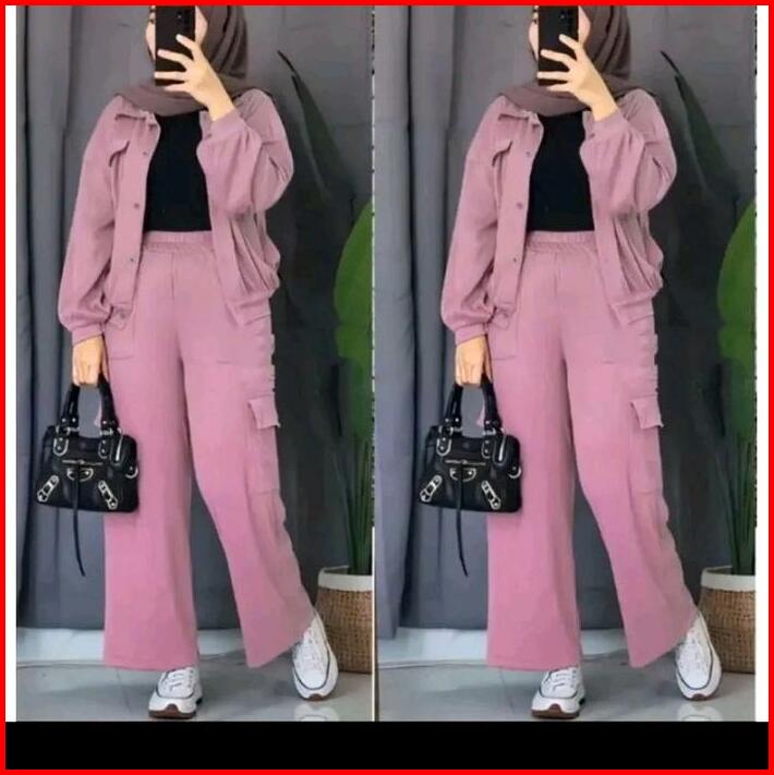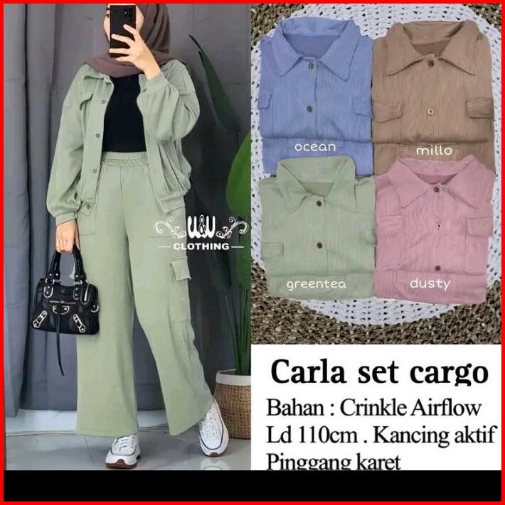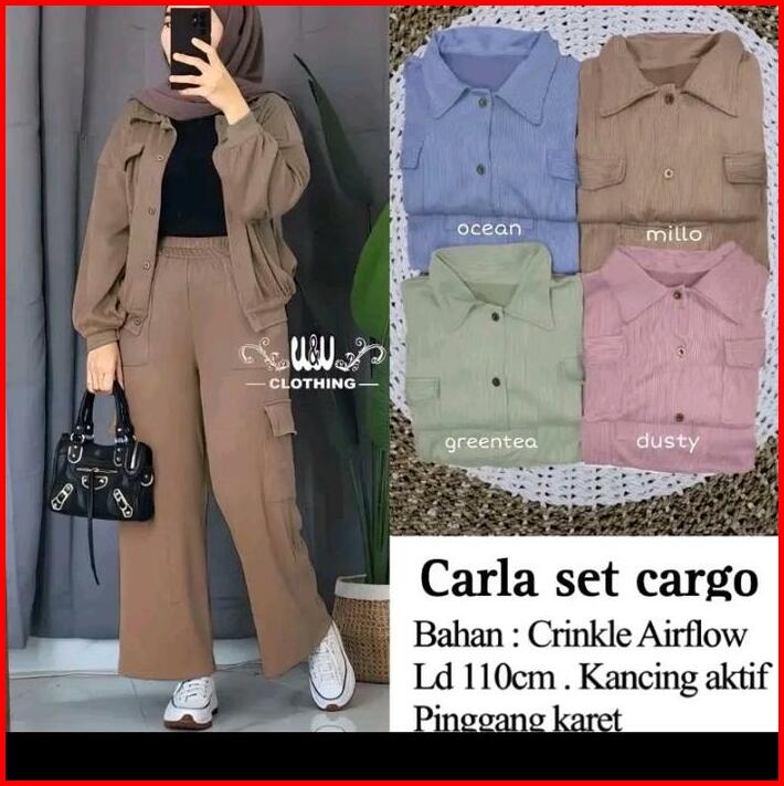 Carla Set Cargo Bahan Cringkle Setelan Cargo Saku Wanita Carla Set Cardigan Kancing Muslim Airflow Baju Celana Panjang