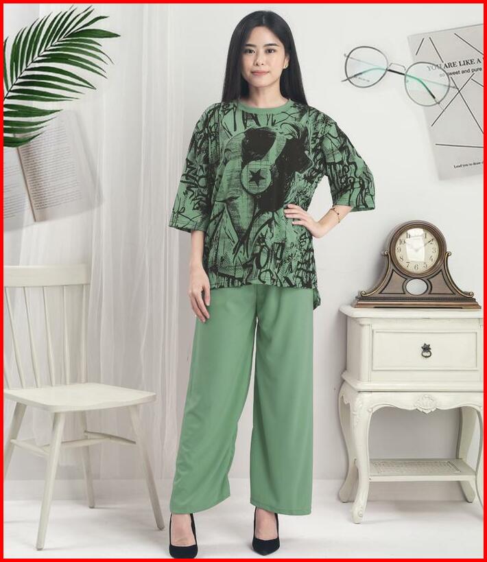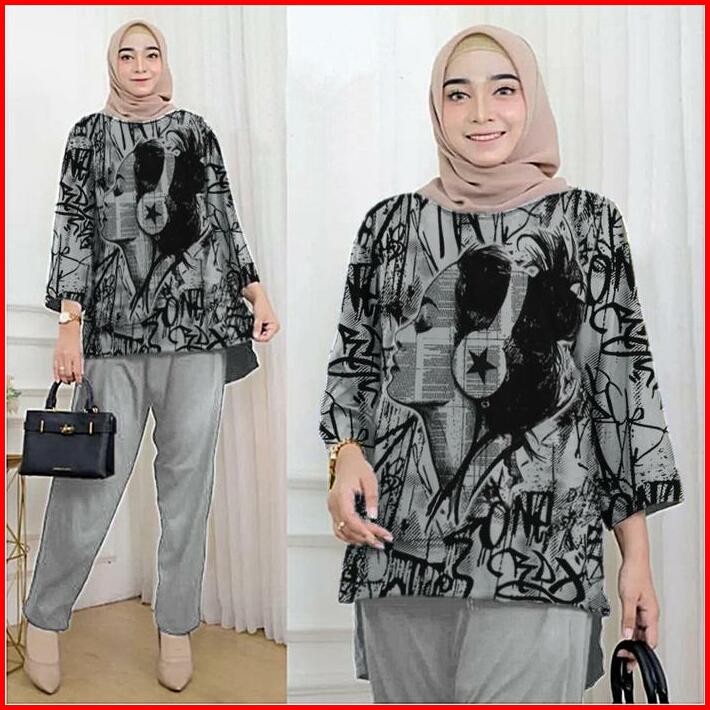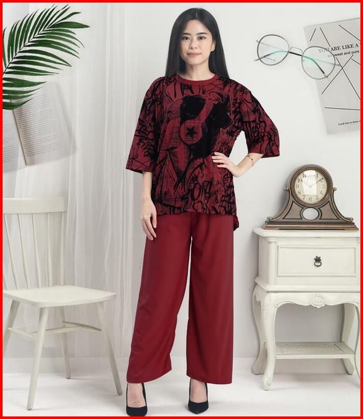 One Set Wanita Setelan Oversize Abstrak Girl Crepe Atasan Celana Dewasa